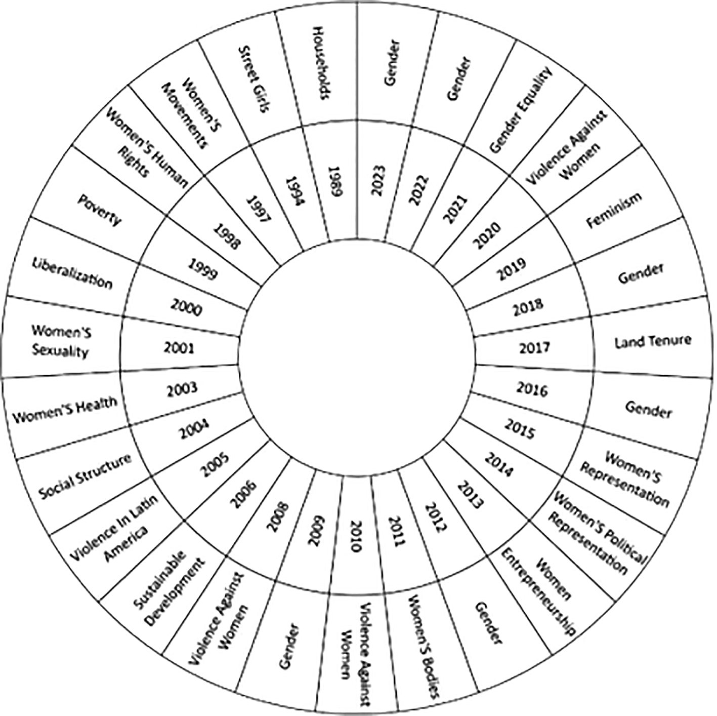 • What are the growing and emerging keywords in the field of women’s studies research in Latin America?