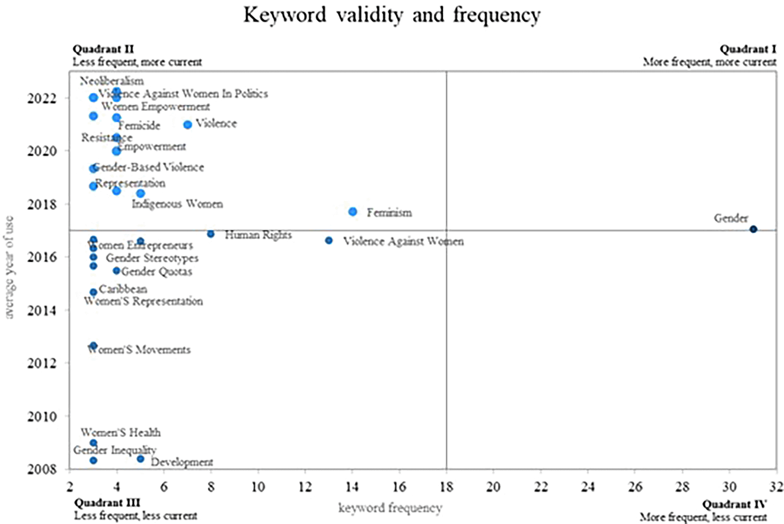 Initially, in quadrant 4 are those terms that have decreased in the most recent years, although they were not found for this quadrant. Subsequently, in quadrant 2 are the keywords that have a low frequency of use; however, they remain valid, which positions them as emerging concepts. Some of these words are Neoliberalism, Violence Against, Women in Politics, Women Empowerment and Femicide. Additionally, in quadrant 1 are the concepts that are frequently used by the authors, these being considered as consolidated and growing terms, as is the case of the gender concept, since its average year of use is recent, thus confirming its importance today.