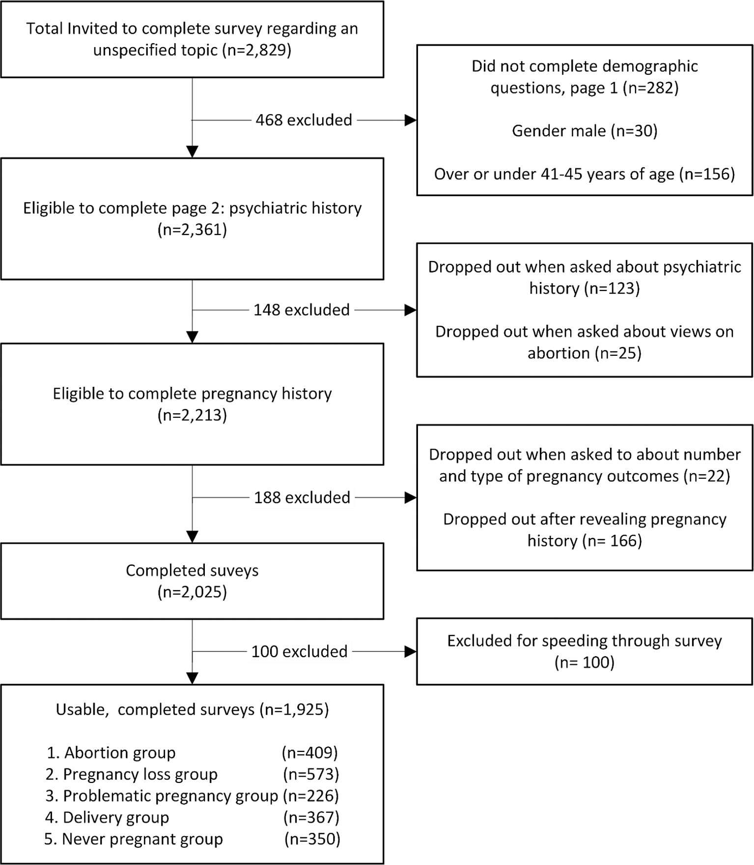 The study population is shown in Figure 1. Respondents who failed to complete all survey questions or fell outside the specified gender and age criteria were excluded from analysis. Of the 2,361 participants who completed the first two demographic questions, 123 (5.2%) dropped out when presented with the psychiatric history section. An additional 25 (1.1%) dropped out when presented with the abortion stigma reduction questions followed by another 22 (1.0%) who discontinued participation when asked to number all of their own pregnancy outcomes. Another 166 (7.0%) withdrew after reporting their pregnancy histories but before completing the full survey. In consultation with Cint, since the survey was designed to take approximately five to seven minutes for respondents to complete, 100 respondents (4.6%) were excluded for finishing in under four minutes to eliminate “speedsters.” This is a subset of persons signing up to complete Cint distributed surveys who randomly respond to questions as quickly as possible in the hope of earning Cint credits without actually reading or attentively responding to the survey items.