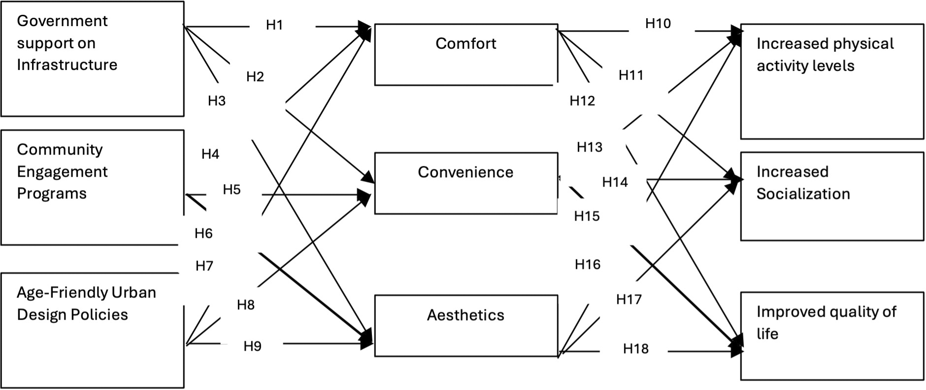 Findings from hypothesis testing indicate that, among the enablers, age-friendly urban design policies are the most significant construct, positively impacting all three mediating variables. Aesthetics was found to have a significant positive effect on increased physical activity level and increased socialization, while comfort and convenience significantly influenced increased physical activity level and improved quality of life, respectively.
