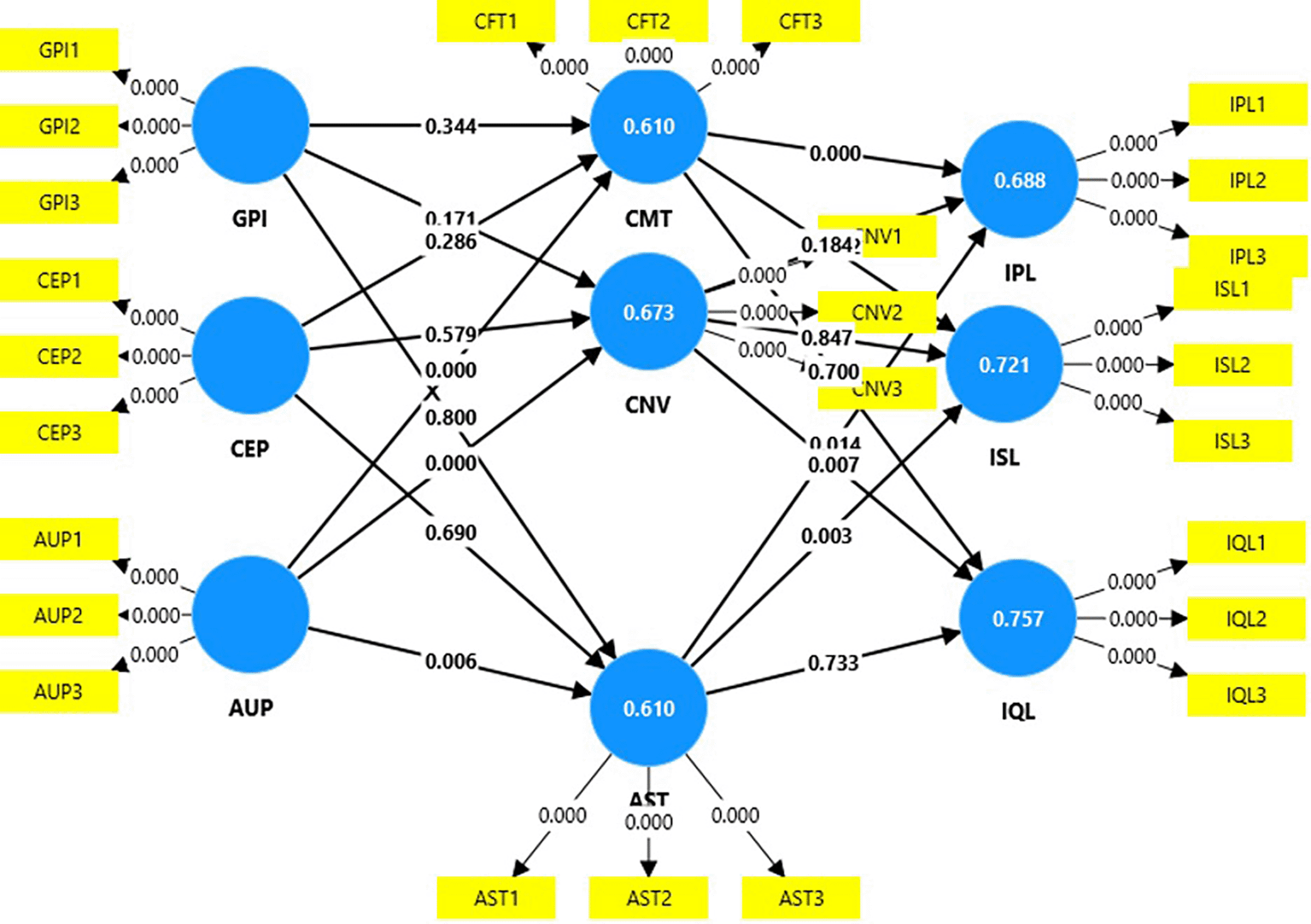 Table 3 demonstrates discriminant validity, which confirms that each construct is distinct from rest of the constructs. The square roots of the AVE values (shown on the diagonal in bold) for each construct are all greater than the correlations with other constructs, indicating adequate discriminant validity. This pattern across all the constructs confirms that each construct in the model uniquely measures its intended concept, supporting the robustness of the measurement model. Thus, the indices in the measurement model confirm that the reliability and validity of the data and the questionnaire, respectively, are acceptable and that the data may be subjected to structural model analysis for hypothesis testing.