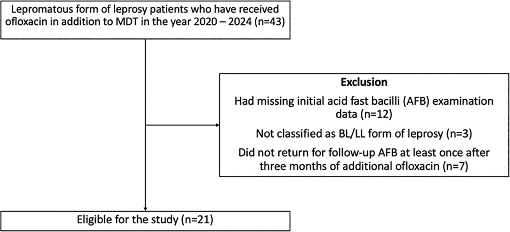 Patients were included if they (1) were diagnosed with leprosy according to WHO criteria; (2) classified as borderline lepromatous (BL) leprosy or lepromatous form of leprosy (LL) based on Ridley-Jopling criteria10; (3) were adults aged ≥18 years at the start of leprosy treatment; and (4) received ofloxacin in addition to the standard multidrug therapy (MDT) regimen under these circumstances: (a) a high initial viable infection load, evidenced by a high MI from acid-fast staining of slit-skin smears; (b) persistently positive MI, typically after ≥6 months of standard MDT; (c) re-positivity of MI; and (d) relapse, diagnosed based on criteria by Linder et al.8,9 To prevent selection biases, patients were excluded if they (1) had missing initial AFB examination data or (2) did not return for follow-up acid-fast bacilli (AFB) examination at least once after three months of additional ofloxacin ( Figure 1).