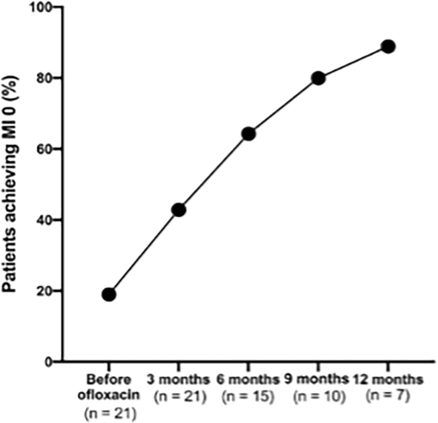 There was a consistent increase in the proportion of patients achieving an MI to 0 following the addition of ofloxacin, demonstrating the treatment’s effectiveness in reducing viable bacterial load over time ( Figure 4).