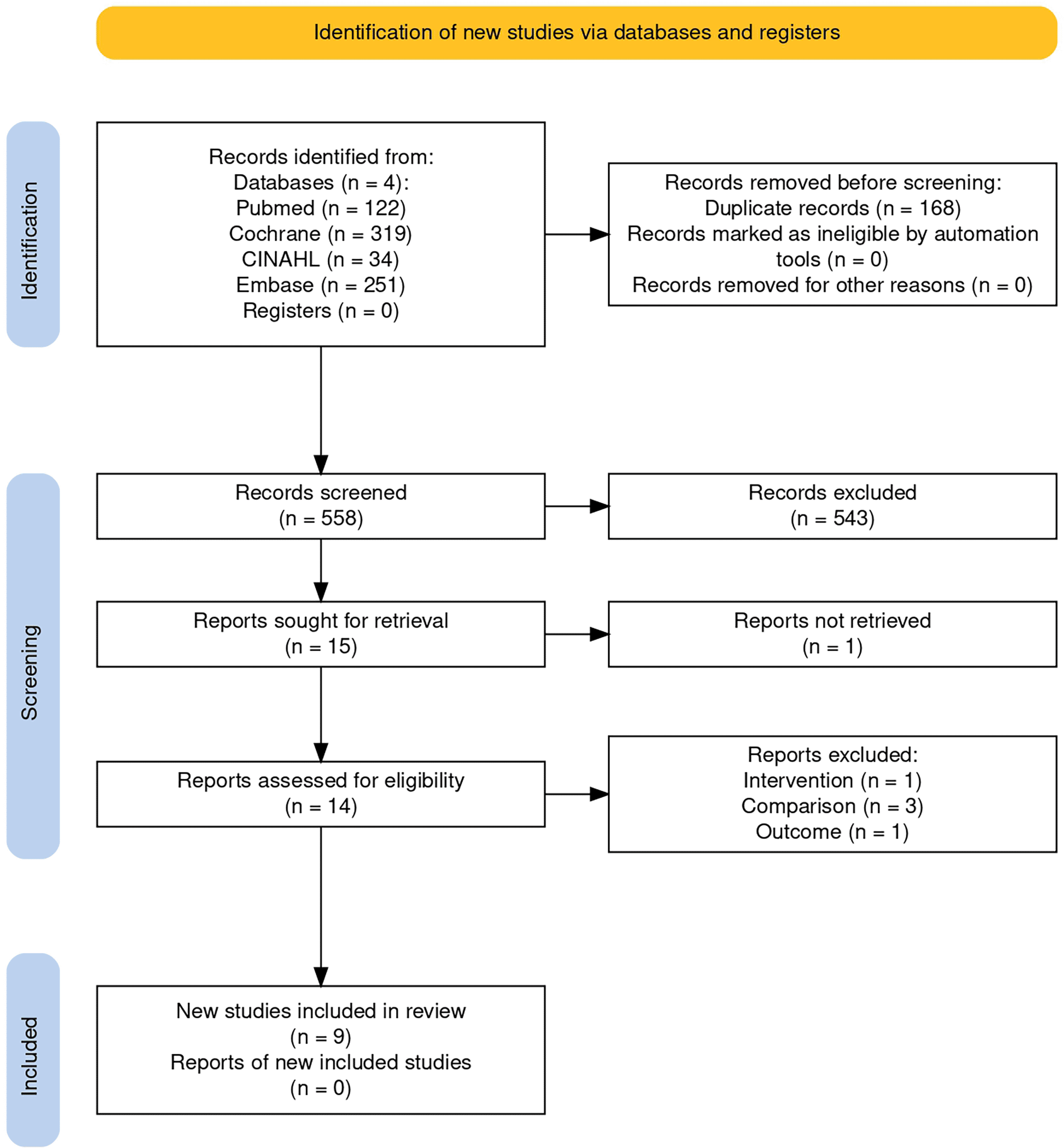 A total of 726 records were identified from the four databases. After excluding duplicates, 558 records were screened based on their titles and abstracts. We excluded 543 records excluded in this process. Of the remaining 15 publications, the full texts of 14 studies were retrieved. The study not retrieved was a conference paper. Despite contacting the author, no response could be obtained. After examining the full texts according to the inclusion criteria, five studies were excluded for the following reasons: in one study, the intervention was not compliant; three manuscripts did not meet the comparison criteria; and one work was excluded because it did not measure the desired outcomes. In the end, nine studies were selected for this research. The selection process is illustrated in Figure 1 with a flow diagram.