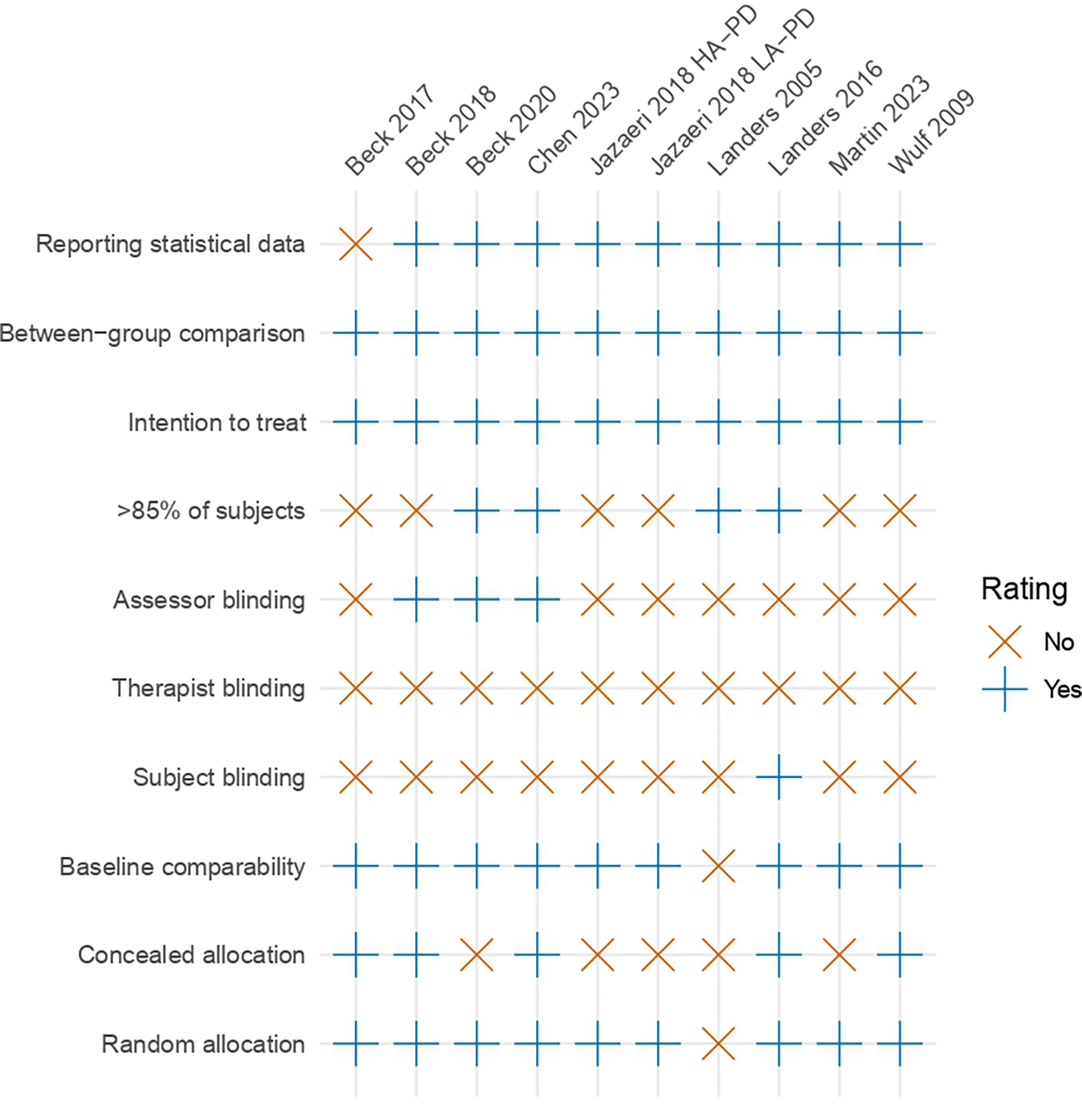 The evaluation of the methodological quality of the included studies showed that the Landers et al. (2016) and Chen et al. (2023) studies had the highest methodological quality of all the selected studies. The Landers et al. (2005) study had the lowest methodological quality with six items at high risk of bias. The study by Beck and Almeida (2017) was the only one to lack statistical information. The criterion of random allocation and baseline comparability presented a high risk of bias only in the Landers et al. (2005) study. All studies showed a high risk of bias for the criterion of therapist blinding. The Landers et al. study (2016) was the only one to specify subject blinding and therefore to show a low risk of bias for this criterion. The assessment of methodological quality is shown in Figure 2.