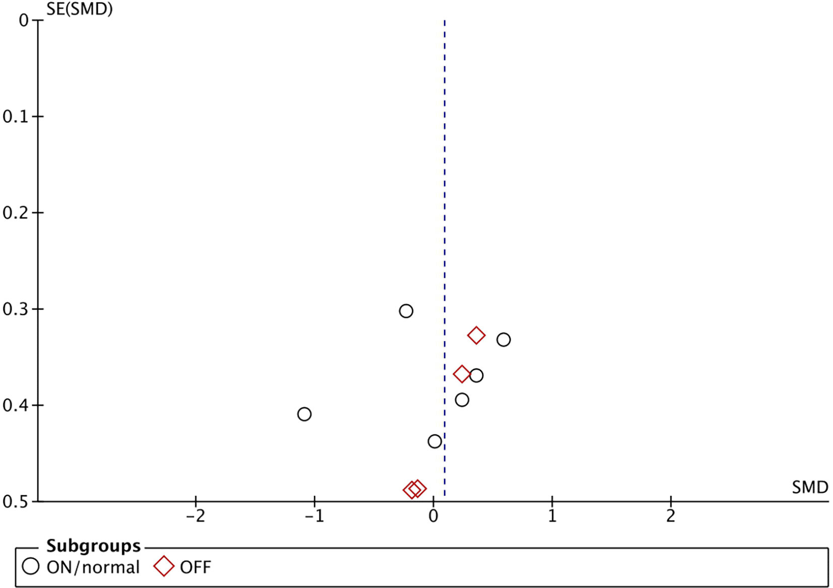 A further limitation is that the meta-analysis of the balance outcome during the ON state showed a moderate heterogeneity. This was probably caused by a single study showing a large effect in favour of the EFA condition (Wulf et al., 2009). To identify potential reasons, we analysed several factors, including the number of participants, stage of the disease, age, order of focus testing, verbal instructions given to participants, and intervention conditions. After investigating these clinical data, we were unable to identify any differences that might explain this disparity compared with the other studies. More specifically, the study did not involve a longer training duration and comprised only a single session. Participants were considered in the ON state, the average age was 71 years and the disease stage involved H&Y stages II and III.
