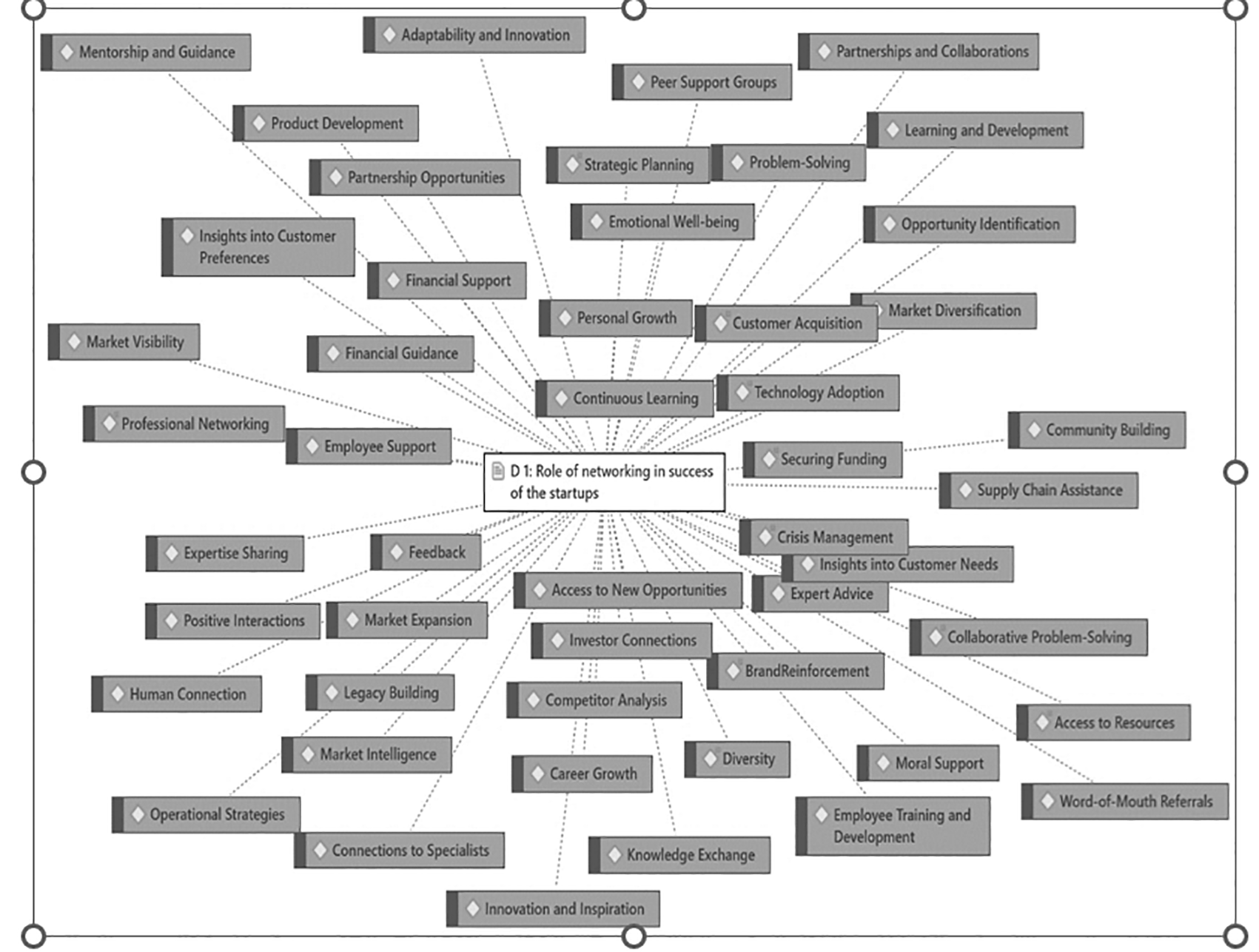 Based on the insights gathered from the interviews, some of the references are mentioned below with a thematic map, as provided in Figure 1. Networking serves as a multifaceted tool that contributes significantly to various aspects of a startup’s journey. It facilitates product development by providing avenues for collaboration, feedback, and idea exchange with industry experts, potential customers, and fellow entrepreneurs. This collaborative environment fosters innovation and helps refine the startup’s offerings to better meet market needs.