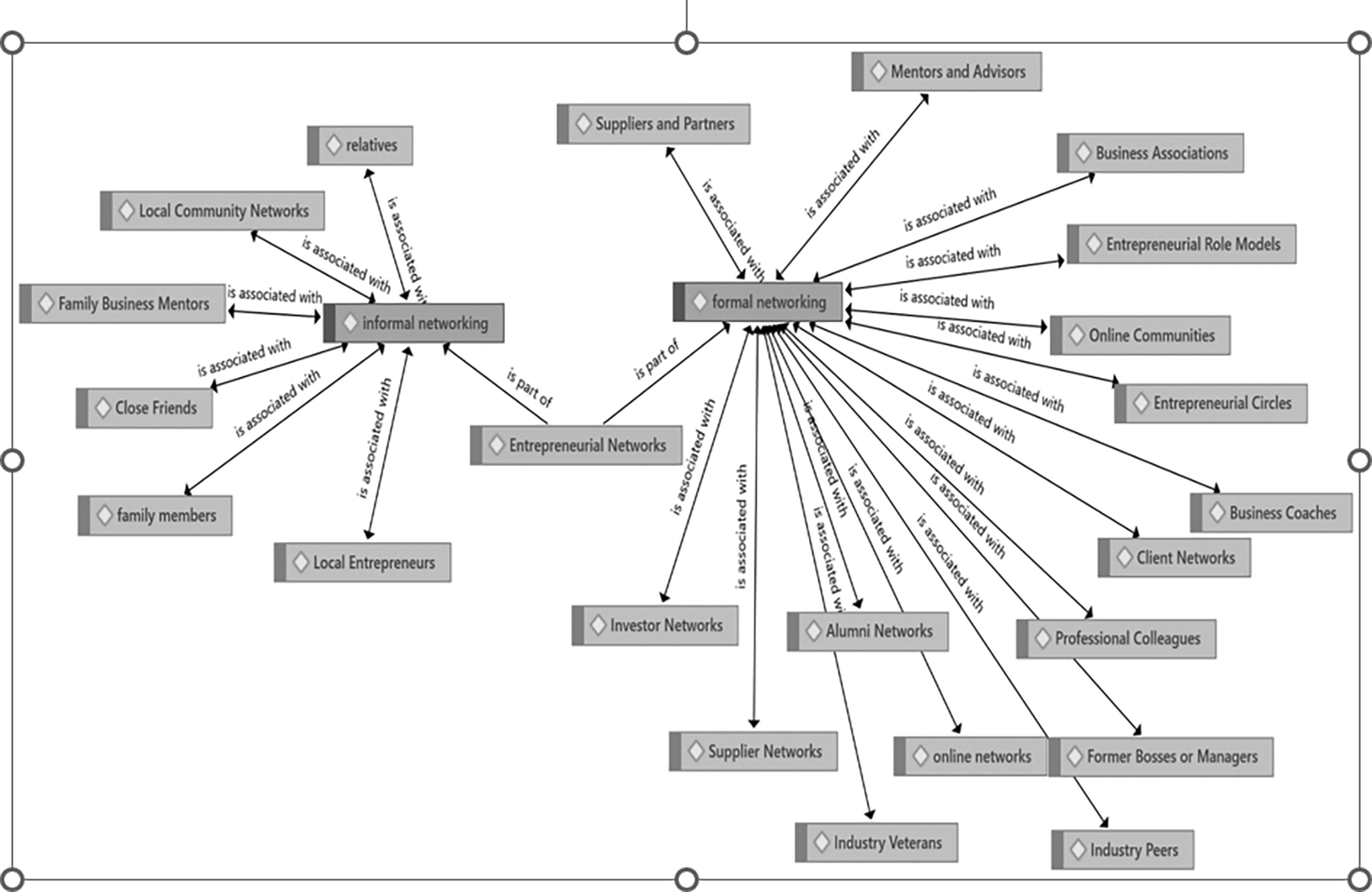 Strong and weak ties on social media offer various forms of support, which is crucial for the growth of startup businesses. The most helpful contacts for startups were friends, business angels, and business partners, but they also leverage weak ties to get different kinds of help. Although business incubators were utilized by a large number of entrepreneurs, their assistance in creating external networks and connections was not well recognized (Durda & Ključnikov, 2019). Formal and informal networking is crucial to the success of a startup (Sharafizad, 2014). Formal networking refers to intentional and structured efforts to establish connections with other professionals and organizations (Witt, 2004). On the other hand, informal networking refers to the natural and spontaneous relationships that develop through day-to-day interactions and personal connections. These informal networks often include friends, family, colleagues, and mentors who can provide support, advice, and potential business opportunities (Abou-Moghli & Al-Kasasbeh, 2012; Albourini et al., 2020; Gloor et al., 2018; Ferreira et al., 2022). The combination of both formal and informal networking can provide startups with a wide range of benefits. Formal networking allows startups to expand their professional network, connect with industry leaders and experts, and gain access to valuable resources such as funding opportunities, partnerships, and market insights. On the other hand, informal networking helps startups build relationships based on trust and personal connections. These relationships can provide emotional support, mentorship, and access to informal knowledge and advice. Additionally, formal networking can provide startups with credibility and visibility within their industry, enhancing their reputation and attracting potential customers or clients (Klerk & Saayman, 2012; Sharafizad, 2014; Stuart & Sorenson, 2007). On the other hand, informal networking offers startups a support system of trusted individuals who can provide guidance, feedback, and referrals (Sharafizad, 2014; Witt, 2004).