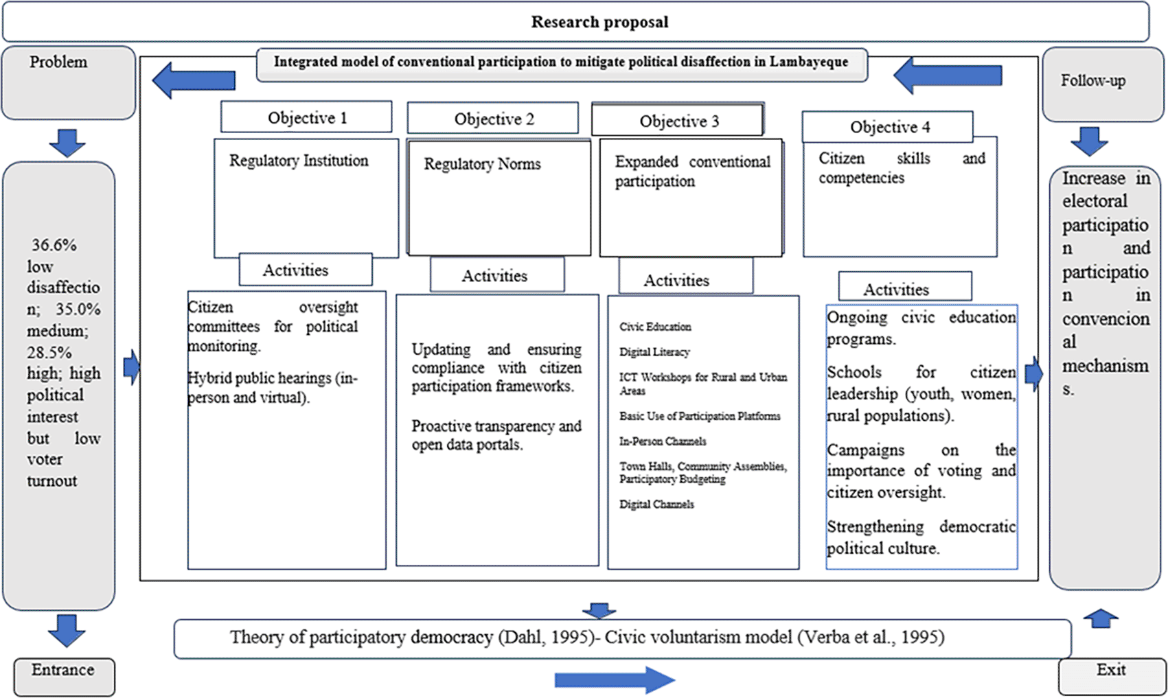 The proposal presented in the article is an integrated model of conventional participation specifically designed to address political disaffection in Lambayeque. Its main objective is to reduce the medium to high levels of disaffection revealed by the study’s findings, leveraging the high political interest observed among these populations to promote their political engagement. The model pursues this objective through three components: normative and institutional reconfiguration, a broad conventional participation mechanism, and the strengthening of civic education and digital literacy, which work together to address different dimensions of political disaffection.