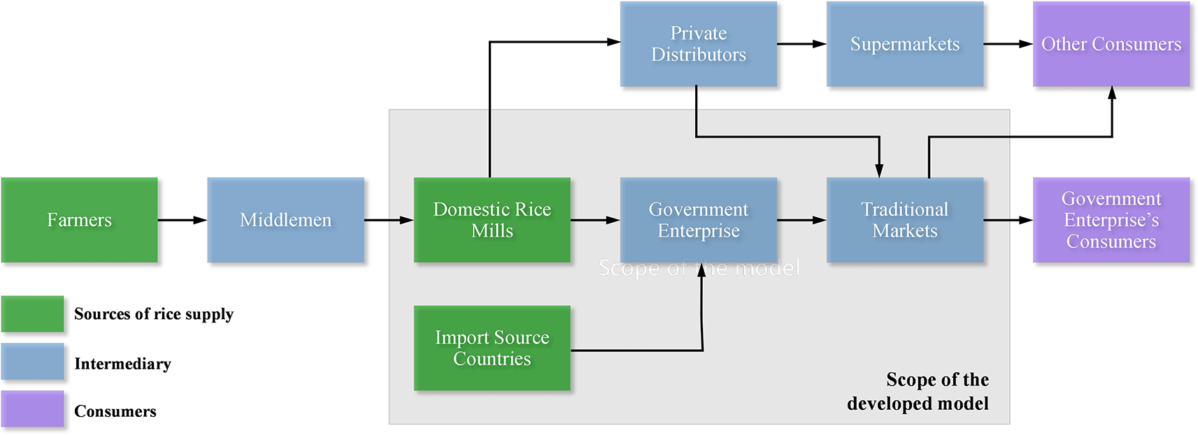 In procuring rice, government enterprises have two sources: domestic rice mills and rice imports. The rice supplied by government enterprises is stored and subsequently distributed to consumers to meet their demand. When the retail price of rice in the market is high, government enterprises conduct market operations by increasing the distribution of rice to the market or importing rice from source countries to enhance rice availability. Consumers purchase rice from government enterprises through traditional markets. This study models the rice supply chain network, which includes domestic rice mills, import source countries, national rice warehouses owned by government enterprises, and traditional markets as points of purchase for consumers. Figure 1 illustrates the rice supply chain network in Indonesia and the scope of the modelled rice supply chain network in this study.