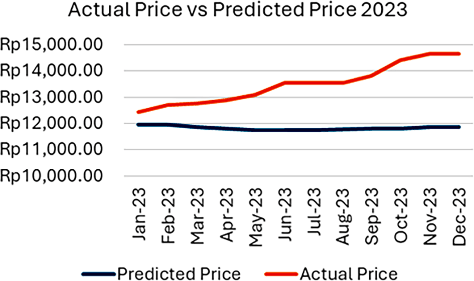 The results for the 2023 simulation period can be seen in Table 11, while the comparison graph of actual and predicted rice prices for 2023 is shown in Figure 2. The Mean Square Error (MSE) value resulting from the comparison between predicted and actual rice prices is IDR 3,363,769.44 (BPS-Statistics Indonesia, 2022h). This value is notably high due to the increase in the retail market price of rice in 2023, driven by factors such as rice scarcity, preparations for the 2024 election, and the lingering effects of the post-COVID-19 pandemic. Based on the predicted price values, Table 12 shows the actual and predicted rates of price increase between consecutive months in 2023.