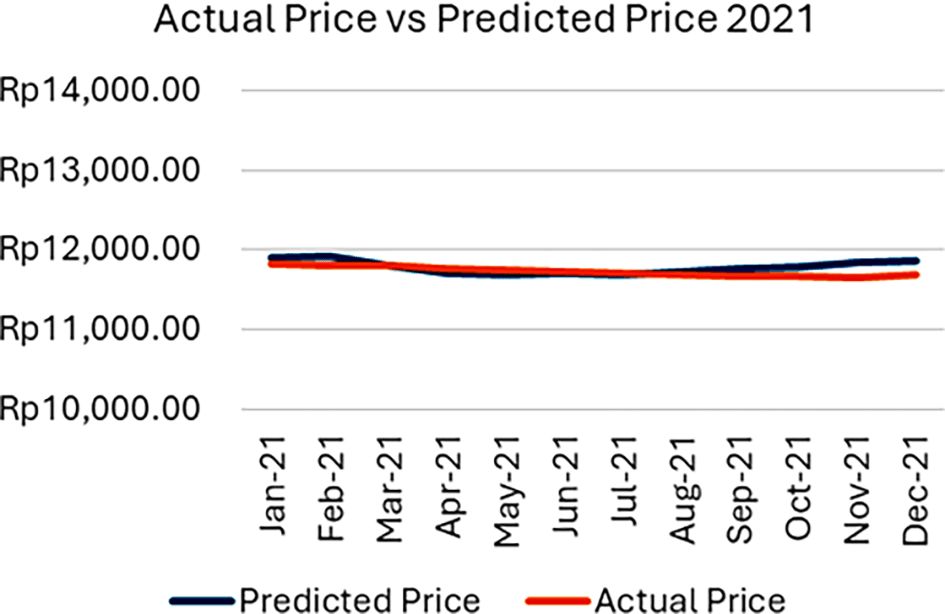 The results for the 2021 simulation period are presented in Table 15, while the comparison graph of actual and predicted rice prices for 2021 is shown in Figure 4. The Mean Square Error (MSE) value resulting from the comparison between the predicted and the actual rice prices is IDR 9,604.53, indicating that the developed model represents the actual price in 2021 quite accurately. In 2021, the COVID-19 pandemic continued to impact Indonesia, leading to a decrease in rice demand and a reduction in rice prices per kilogram. Based on the obtained price predictions, Table 16 shows the actual and predicted price increase rates between consecutive months in 2021.