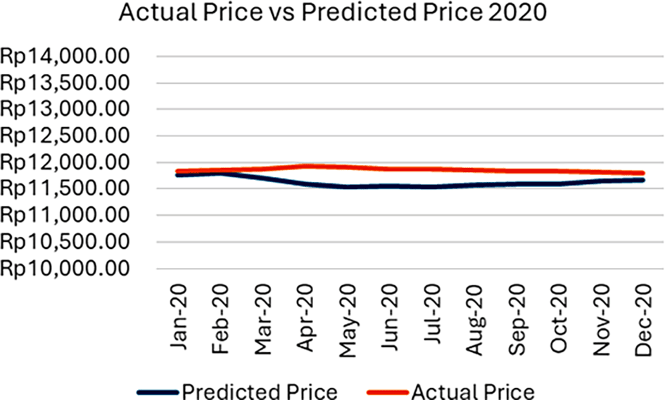 The results for the 2020 simulation period are presented in Table 17, while the comparison graph of actual and predicted rice prices in 2020 is shown in Figure 5. The Mean Square Error (MSE) value resulting from the comparison between the predicted and the actual rice prices is IDR 62,490.62, indicating that the developed model represents the actual price in 2020 quite accurately. In 2020, the COVID-19 pandemic began to hit Indonesia, which caused rice demand to decrease and the rice prices per kilogram decreased from April and carried over until 2021. Based on the obtained price predictions, Table 18 shows the actual and predicted price increase rates between consecutive months in 2020.