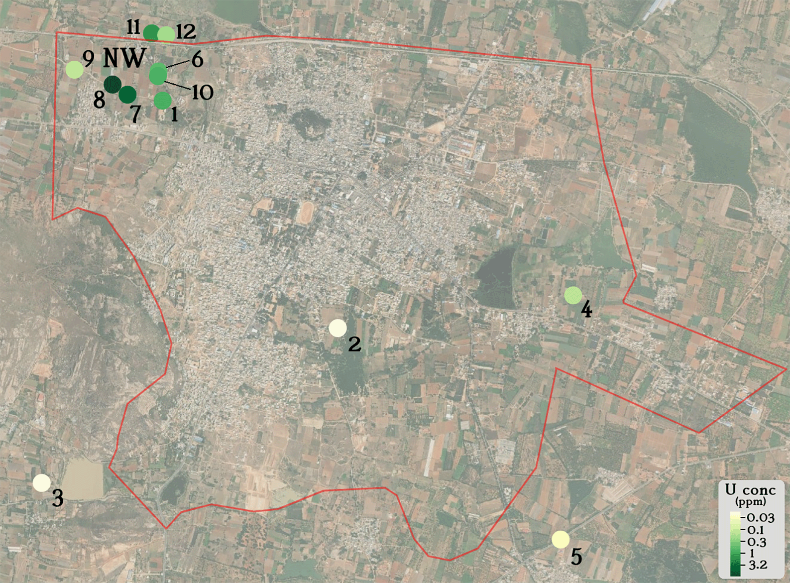 Groundwater from 12 borewells in Chintamani village, Chikkaballapura District, Karnataka, India were sampled from August 2024 to December, 2024. Initially, we collected groundwater samples from borewells 1-5 that were evenly distributed around the geographical area of Chintamani village. Groundwater from borewell 1 displayed the highest uranium concentration from this cohort (0.771 ppm U), leading us to sample groundwater from more borewells around borewell 1 in the northwestern region of Chintamani village. We found a statistically significant difference (p = 0.048, Welch 2-sample T-test, one-tailed) between the uranium concentration of groundwater in the northwestern region (NW, borewells 1, 6-12) compared to groundwater in the rest of Chintamani village (borewells 2-5).