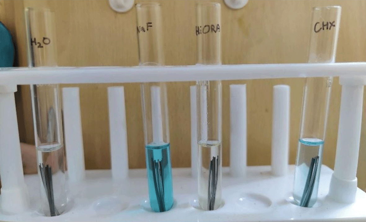Six specimens of each of the three wire types were immersed in glass test tubes containing four different test solutions of 7ml each ( Figure 1).