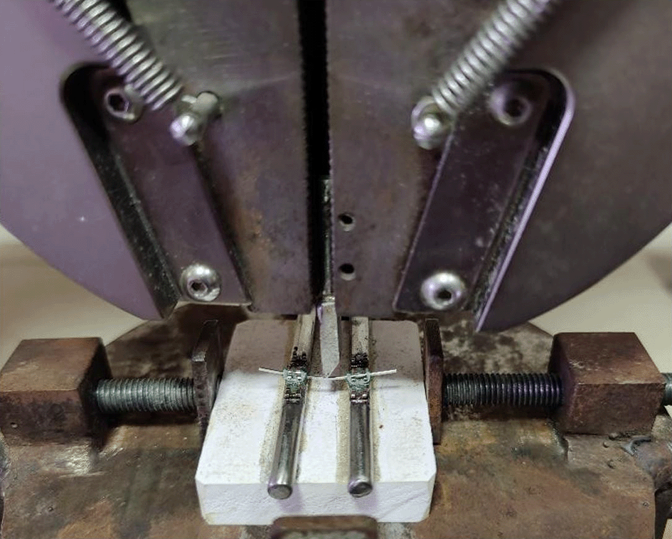 After three months of repeated immersion, a customized jig was made for the wires based on a study conducted by Aghili et al.2 It consisted of 2 cylindrical metal rods bonded on top with two MBT stainless-steel brackets of 0.022 x 0.028” dimension with an inter-bracket distance of 15.5 mm. The wires were placed in the brackets and fixed with ligatures (3M AlastikTM modules) to keep them stable. It was mounted on top of rectangular acrylic blocks ( Figure 2). The 3-point fixture had a 15.5 mm support span, with the wire deflected in the middle, per Wilkinson’s model.20 In a male permanent dentition, It resembles the space between the maxillary central incisor bracket and the maxillary canine bracket on the same side.2