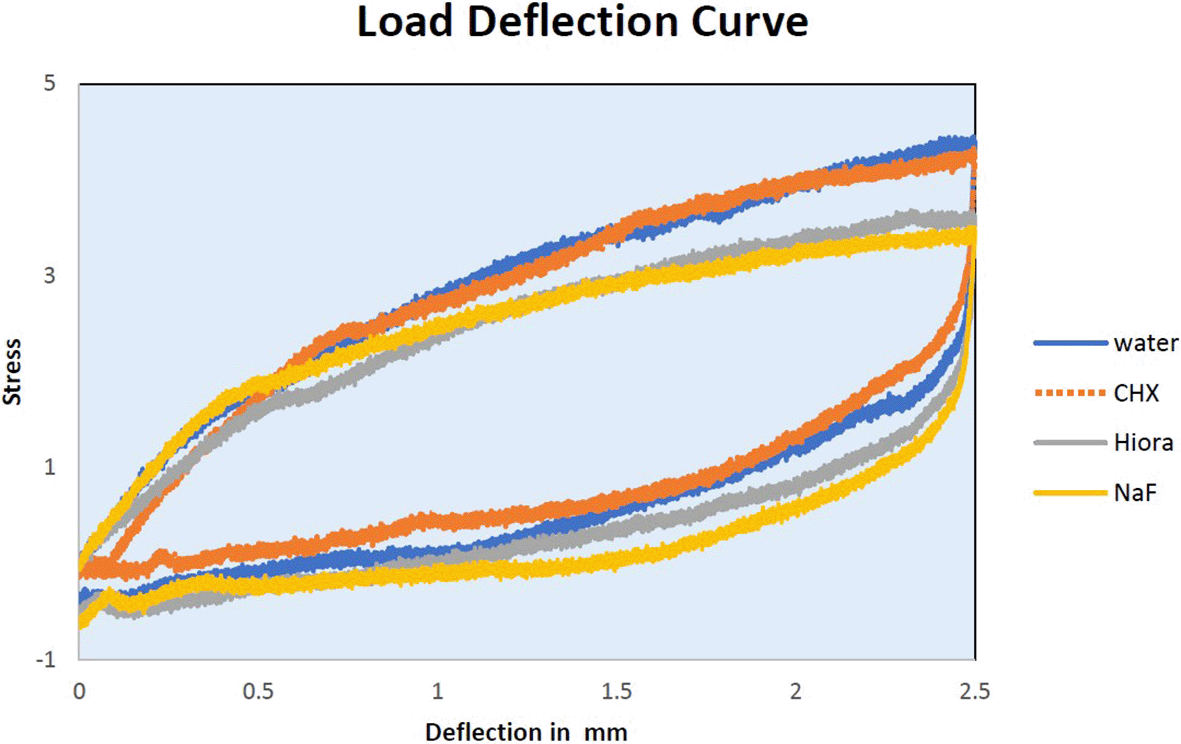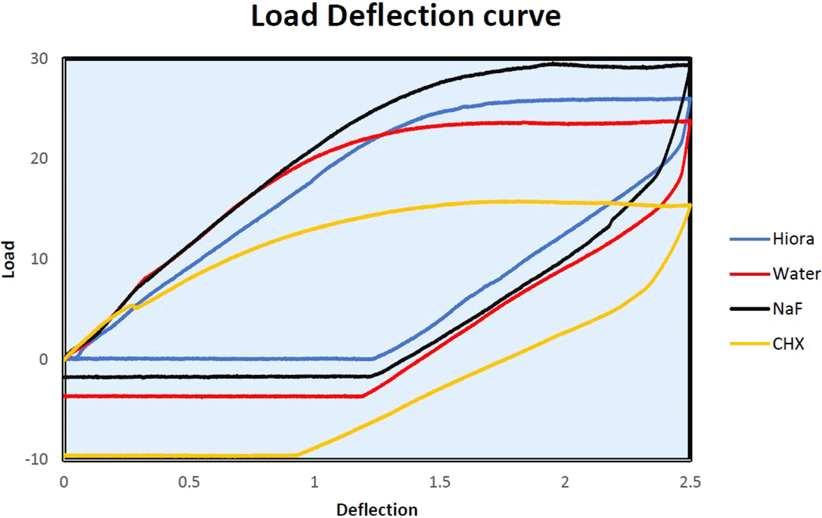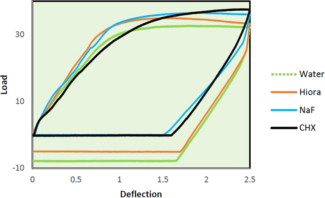 Load deflection: Beta Titanium archwire with NaF showed a minor increase of loading forces between 1mm to 2.0 mm w.r.t control, whereas, with the CHX group, it shows a marked decrease of loading forces required for the same deflection from 0.5mm to 2.5mm. HiORA again was deemed to have a very gentle effect similar to control, whereas the increase of loading forces between 1.5mm to 2.0 mm to control. This implies that the mechanical properties of the archwire become weaker when treated with CHX mouthwash.