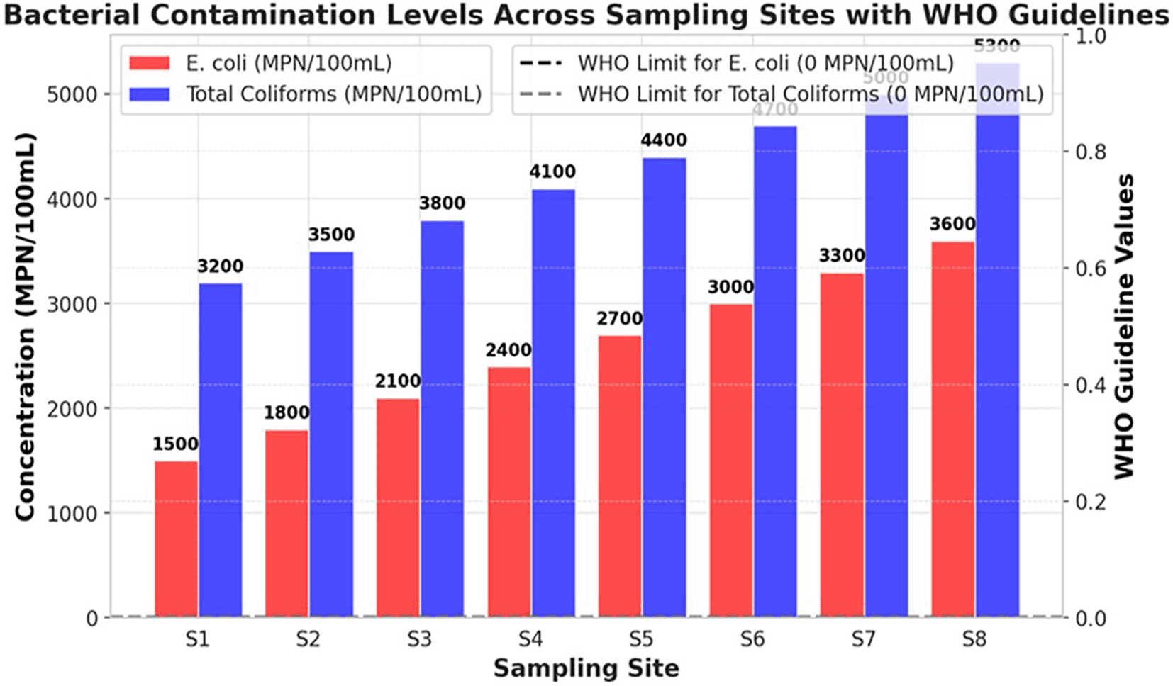 The investigation measured water quality and health-related risks by analyzing physicochemical parameters, heavy metals, and microbial pollutants at eight sampling points, site 1 (S1) through (S8).