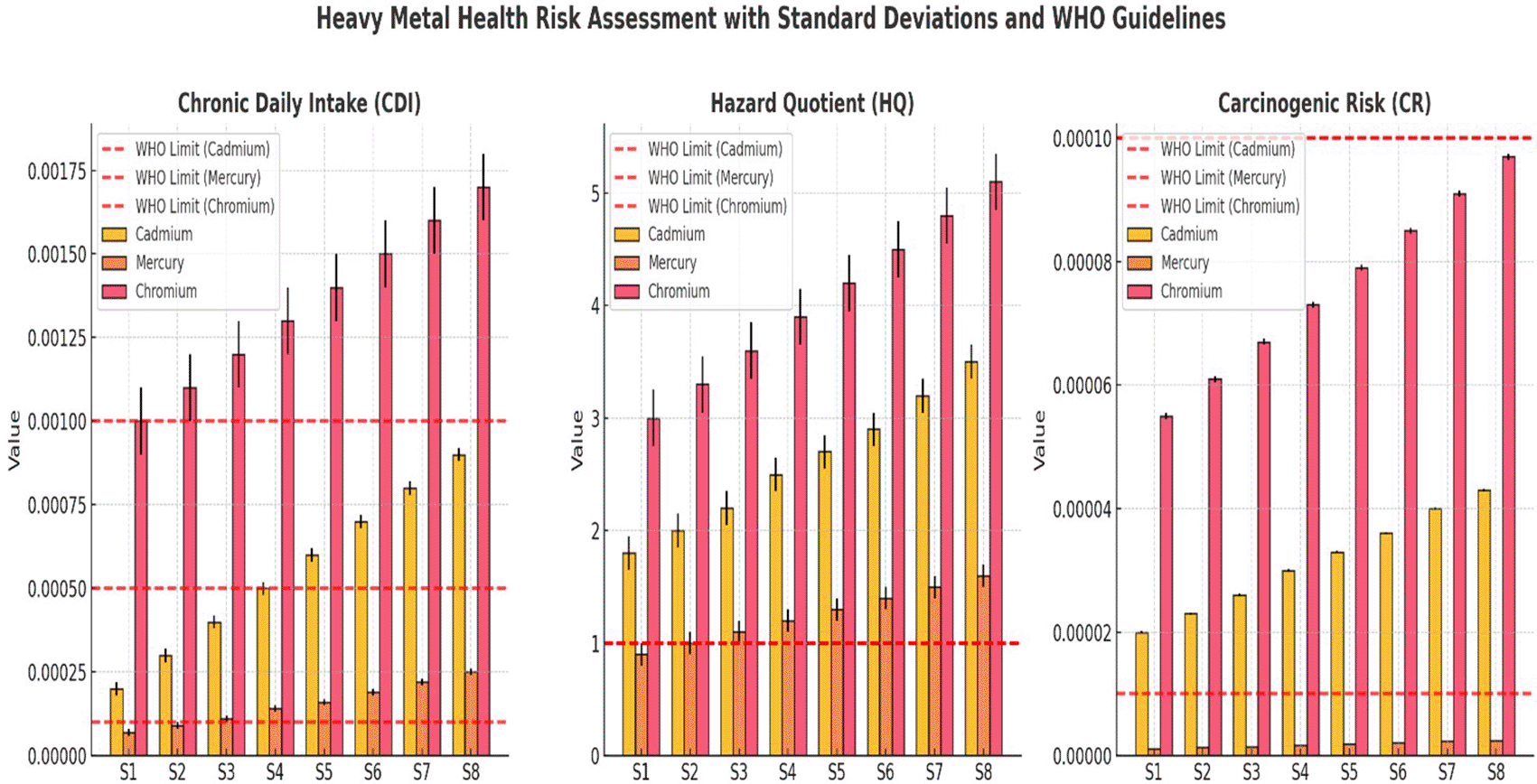 To evaluate the potential health risks associated with long-term exposure to heavy metals, three key risk assessment models were applied: Chronic Daily Intake (CDI), Hazard Quotient (HQ), and Carcinogenic Risk (CR).