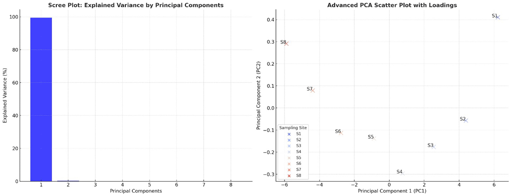 The research data were statistically analyzed using IBM SPSS v26 and Microsoft Excel for processing. All parameters received descriptive statistical treatment using the mean and standard deviation assessment. A Pearson correlation test was used to examine the relationship between water quality and heavy metal content, as well as microbial contamination levels. Principal Component Analysis (PCA) used to detect the main pollution sources affecting the Ichu River.