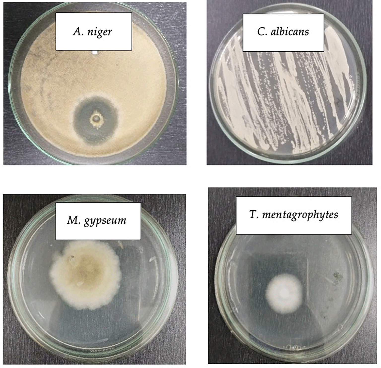 Macroscopically, although M. gypseum and T. mentagrophytes did not differ significantly, having white hyphae, T. mentagrophytes colonies appeared denser and slightly whiter with a protruding rough or powdery surface corroborating Frías-De-León et al’s findings (Frías-De-León et al., 2020) that T. mentagrophytes colonies were often white to slightly yellowish-white and could sometimes turn violet-red, brown, or pale yellowish with a surface resembling cotton, wax wovwn or granules.