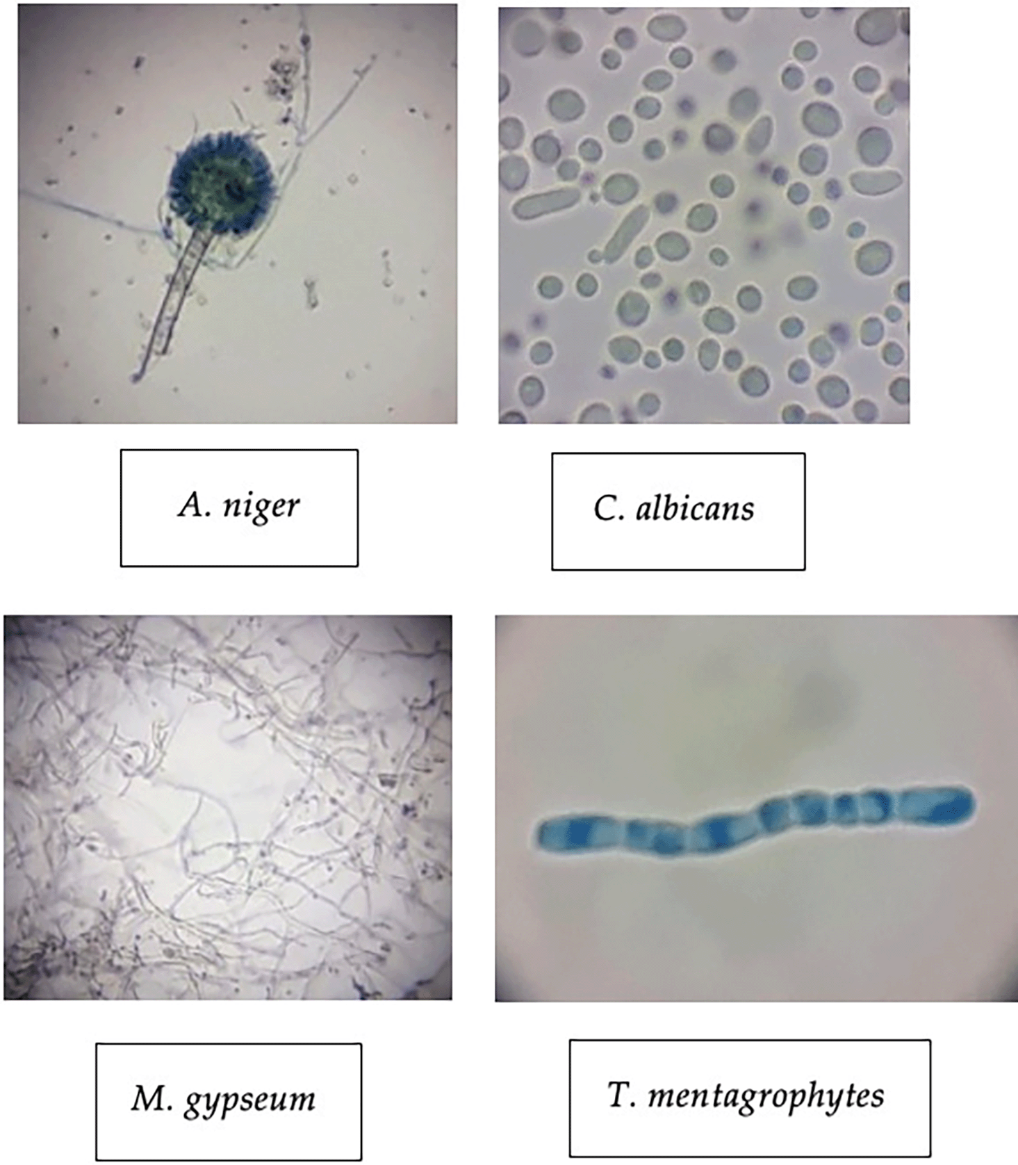 The four test fungi were also identified microscopically (1000x) to corroborate their characteristics. A. niger, C. albicans, M. gypseum and T. mentagrophytes shared similar characteristics with the same fungi theoretically. Figure 3 showed the identification results of the test. The A. niger shows that this fungus has an elongated shape with visible fungal part such as conidia, vesicles, and conidiophores that were obvious by the staining process. Meanwhile, Figure 3 depicting the C. albicans compared to A. niger. C. albicans has a variable round shape with a bluish color and nonuniform cell size. Each cell shows a different individual because this fungus is a unicellular microorganism.
