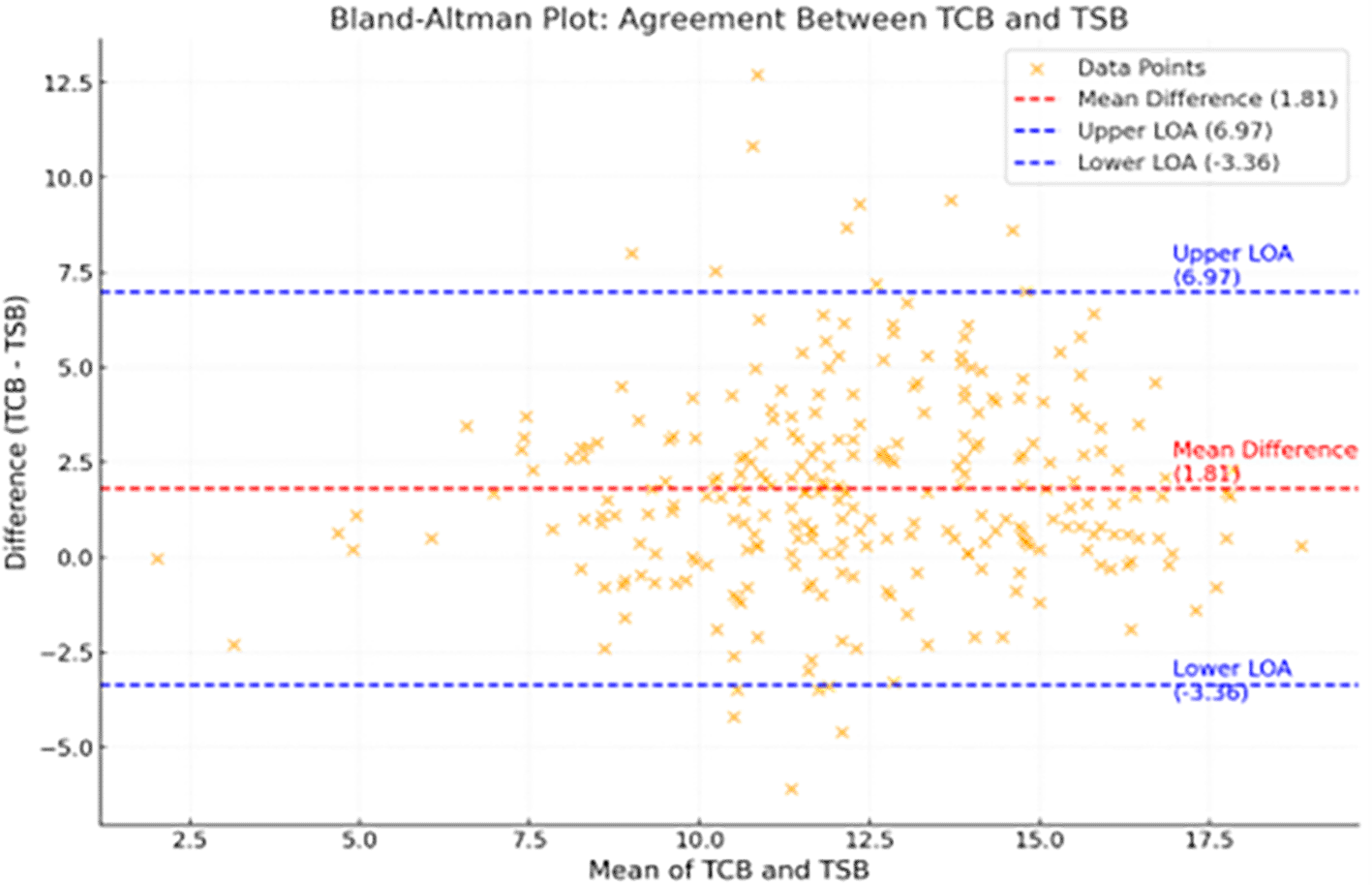 The Bland-Altman analysis in this study demonstrated a mean bias of +1.81 mg/dl, indicating that TcB values tended to be slightly higher than the corresponding TSB values. The 95% limits of agreement ranged from −3.36 mg/dl to +6.97 mg/dl, suggesting that, for most paired measurements, TcB values could be as much as 3.36 mg/dl lower or 6.97 mg/dl higher than TSB. Most data points fell within approximately 5.16 mg/dl of the mean bias, consistent with the calculated limits of agreement. Although the overall mean difference was small, the relatively wide limits indicate that individual discrepancies between TcB and TSB may be clinically significant, particularly at higher bilirubin levels.