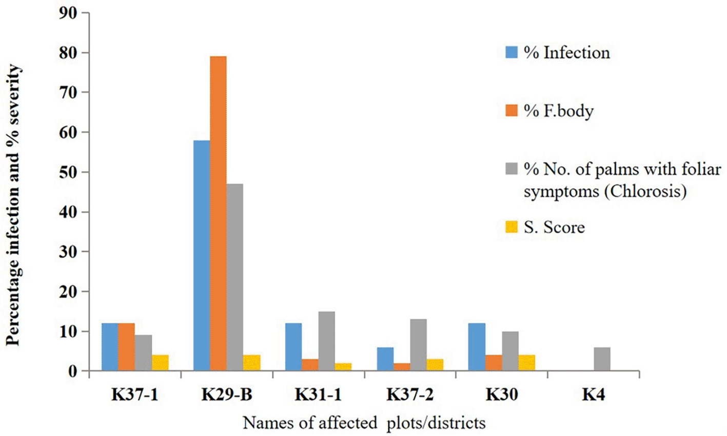 where, 0 = no symptom, and 4 ≥ 9 Maximum number of fruiting bodies per palm or foliar symptoms > 4 fronds/palm