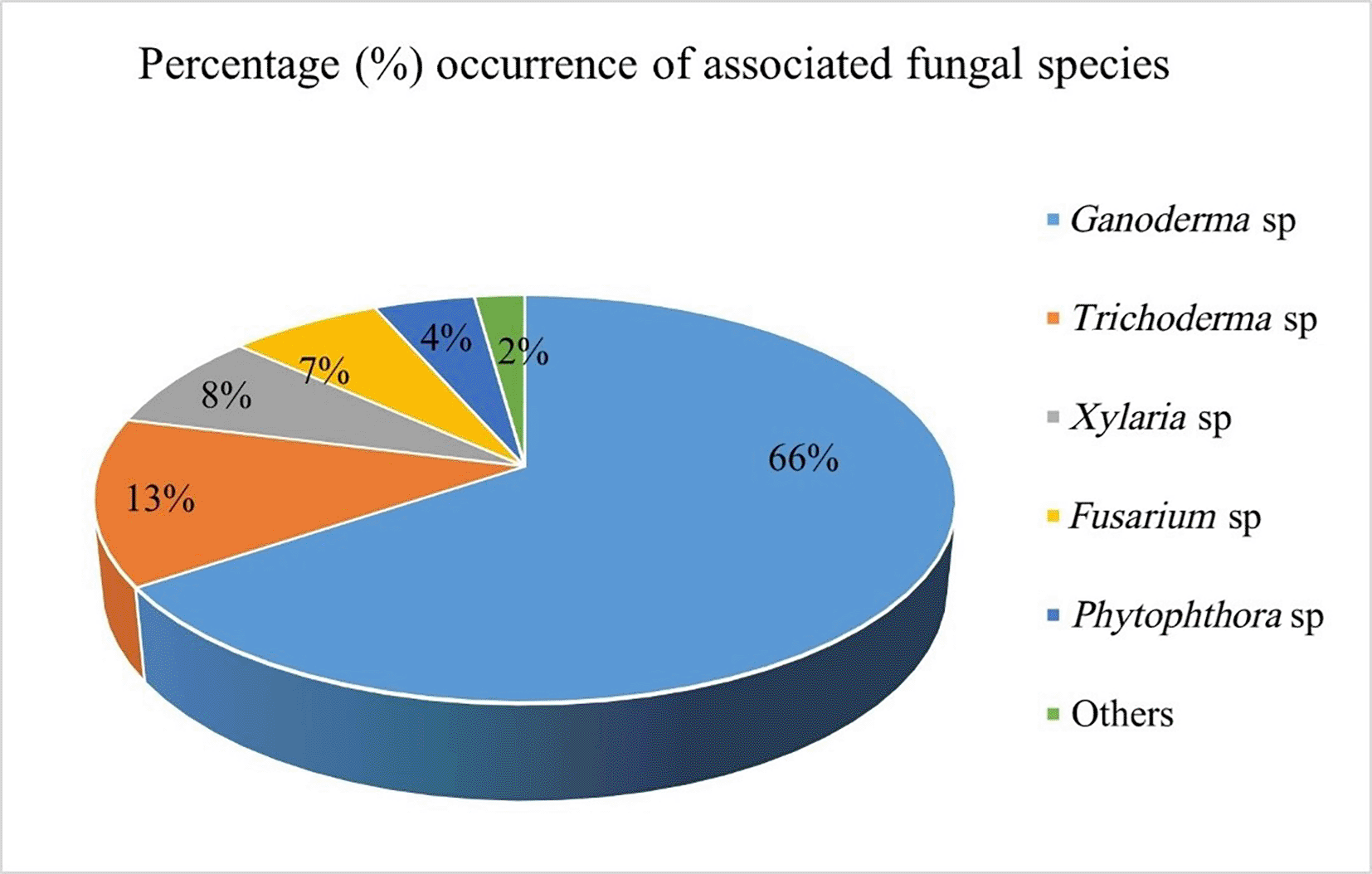 Out of 90 symptomatic samples collected from the field, 60 of them were screened for fungal isolation. 29 categories of fungal cultures were obtained and identified, 24 of them were identified as suspected Ganoderma fungi, and grouped into three (GA, GD2B and TD2B) (Figure 4). Other fungi isolated and identified include Trichoderma, Xylaria, Fusarium, Phytophthora, and others (moulds; Rhizopus, Aspergillus spp.). These fungal isolates were grouped based on their macromorphological characteristics and micrograph features. They were further ranked based on their taxonomy and percentage of occurrences (Figure 3).