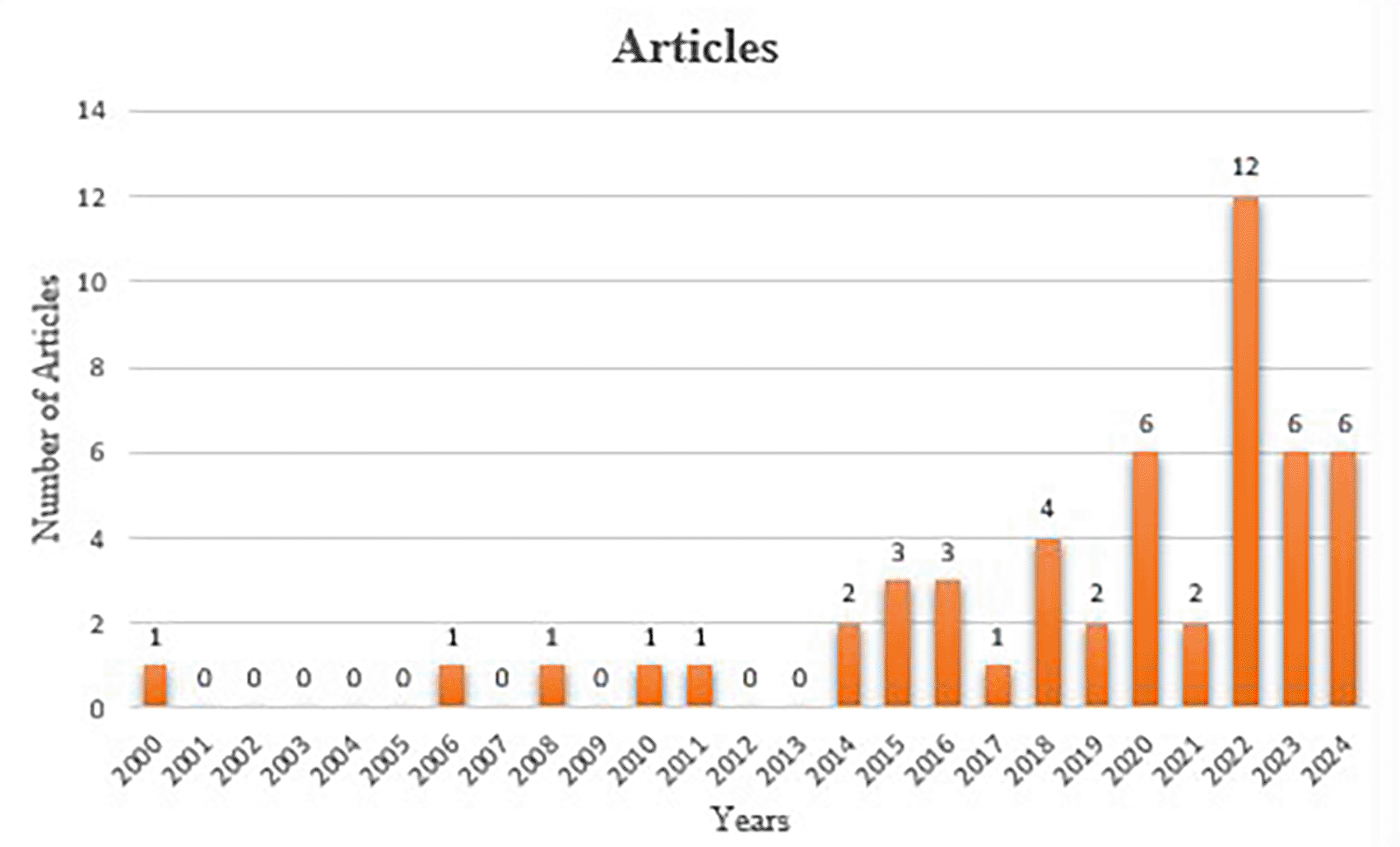 The bar graph depicts annual scientific production from 2000 to 2024 as assessed by the number of papers published each year. The early years, from 2000 to 2004, exhibit negligible productivity, with either no articles or a single article produced each year. From 2005 to 2013, the productivity was consistently low, with sporadic years yielding only one article. A steady rise in scientific output is noted from 2014, commencing with two papers in that year and culminating in four articles in 2017. Between 2018 and 2020, production exhibited minor fluctuations. A major surge happens in 2021, with the publication of 12 papers, the highest output throughout this time span. The output levels out between 2022 and 2024, with six articles released annually. The graph illustrates a gradual onset in the early 2000s, succeeded by consistent growth in subsequent years, culminating in a peak in 2021 and maintained productivity thereafter clearly visible in Figure 3.