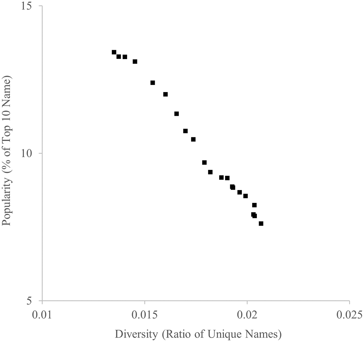 Similarly, the ratio of unique names and the ratio of the top 10 most popular names are indicated in Figure 2. They were also highly negatively correlated, r = −.994.