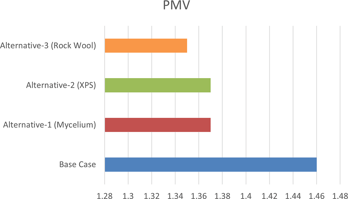 As shown in Table 9, the comparison of the four scenarios in the case study offers key insights for improving thermal comfort. In the base case, without insulation, the Predicted Mean Vote (PMV) is 1.46, with a Percentage of People Dissatisfied (PPD) of 53.26%. Adding Mycelium insulation in Alternative-1 improves the PMV to 1.37 and reduces the PPD to 50.48%. Alternative-2, which uses XPS insulation, shows similar results, with a PMV of 1.37 and a PPD of 50.46%. Alternative-3, featuring Rock Wool insulation, slightly improves comfort further, achieving a PMV of 1.35 and a PPD of 49.76%. As shown in Figures 11 and 12.