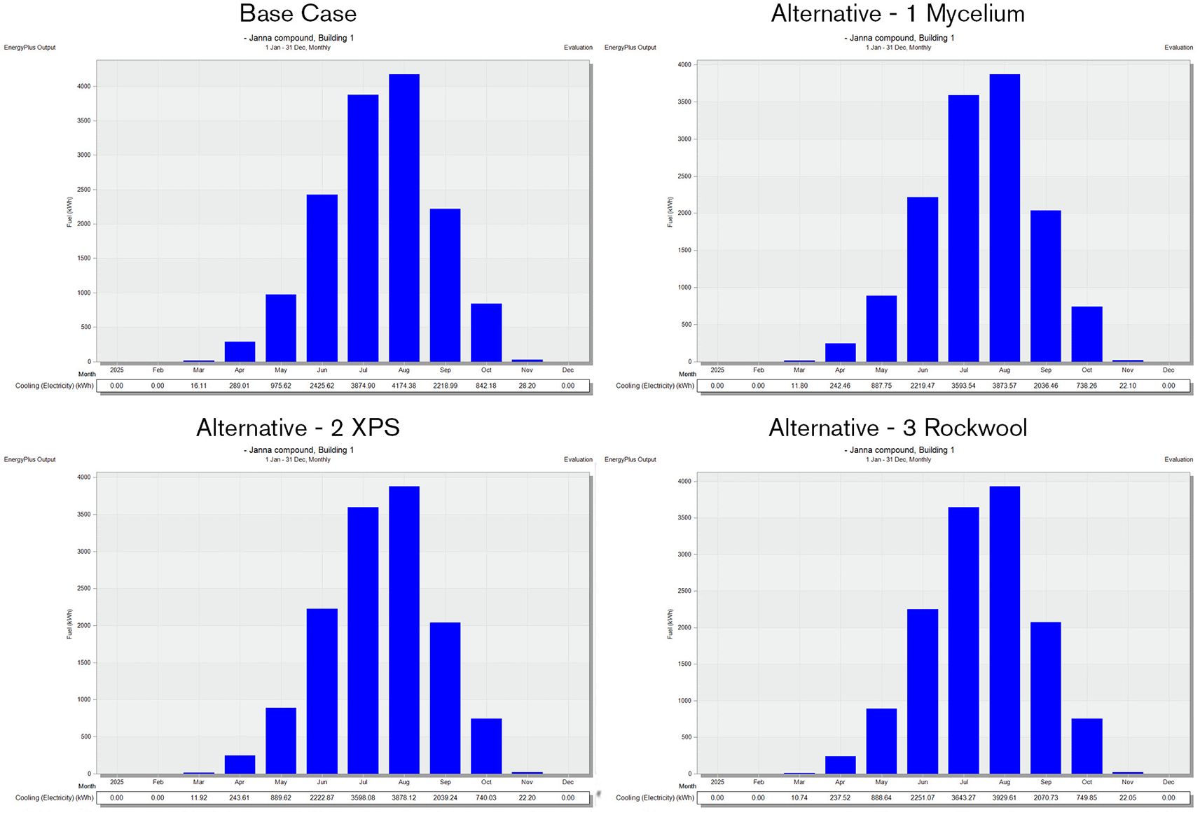 Regarding energy consumption, it is observed that the base case wall material led to higher energy usage during the warmer months. Particularly from May to August, due to increased solar radiation. The simulation findings indicate that the total electricity consumption for the base case during these hot months was 10,203.75 kWh. In comparison, XPS insulation resulted in 8,601.1 kWh, Mycelium insulation consumed 8,587.42 kWh, and Rock Wool insulation had a consumption of 8,838.77 kWh. As shown in Figure 14.