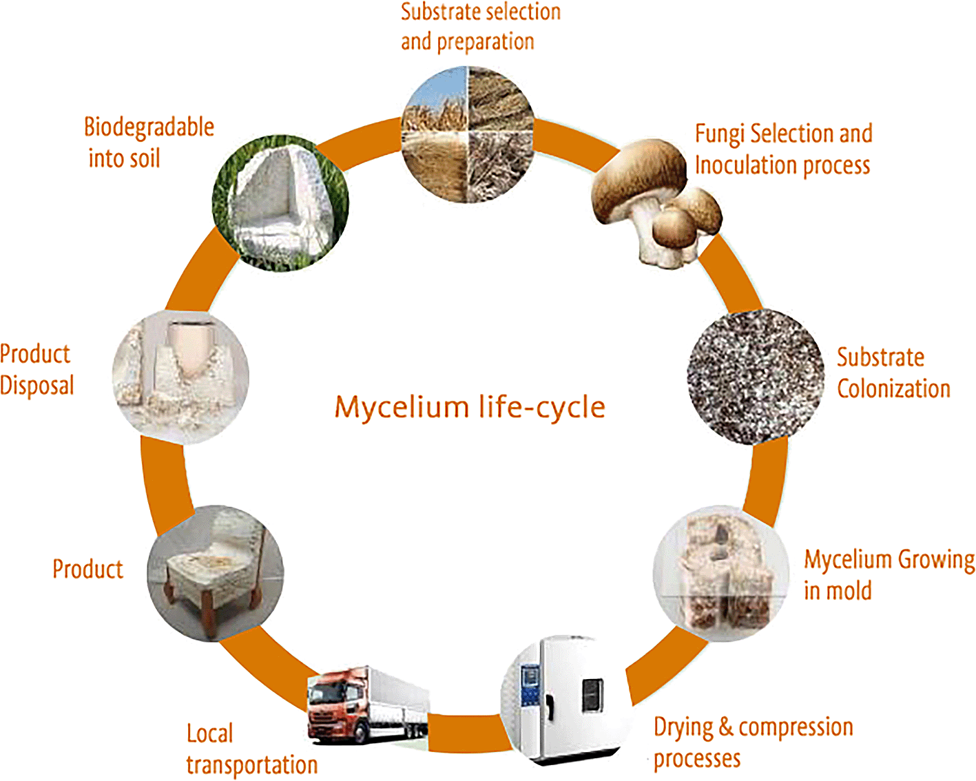 3. The sustainable life cycle of materials sourced from mycelium (shows the sustainable life cycle of mycelium products)