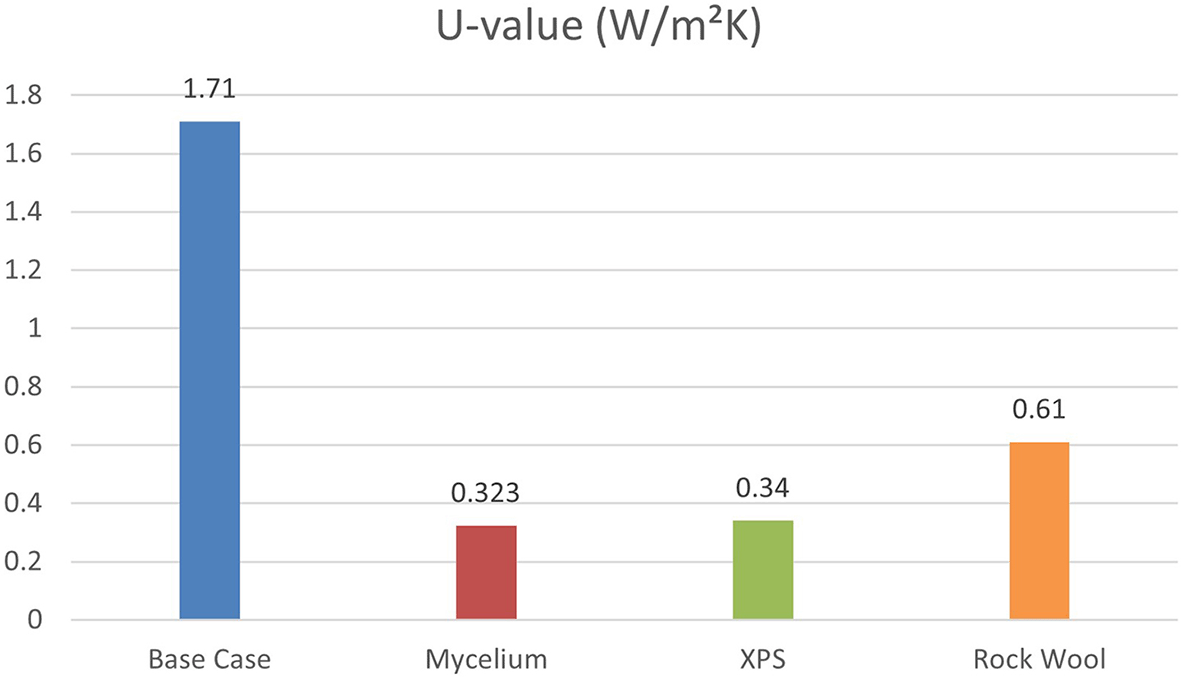 Energy-efficient building design focuses on managing exterior thermophysical properties, such as the U-value (thermal transmittance), which is key for assessing thermal efficiency and energy savings. Figure 7 shows that the base case without insulation has the highest U-value at 1.71 W/m2K, while Mycelium insulation has the lowest at 0.323 W/m2K. XPS and Rock Wool have U-values of 0.34 W/m2K and 0.61 W/m2K, respectively, indicating varying levels of thermal performance. Therefore, Mycelium demonstrates the best U-value compared to other traditional materials.
