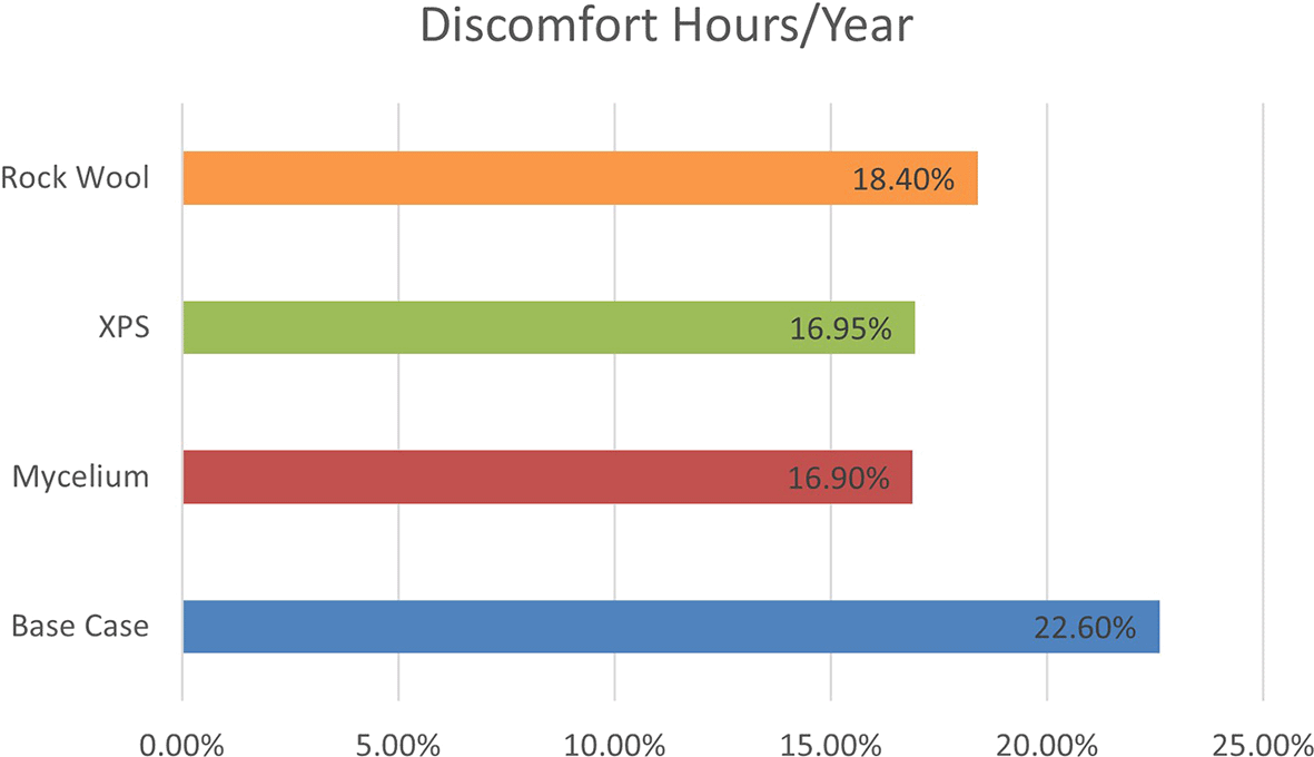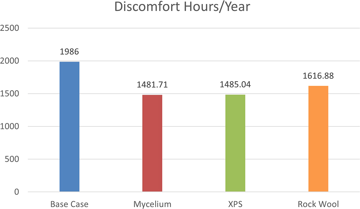The simulation, based on ASHRAE 55–2004 standards, evaluates discomfort hours due to inadequate cooling, heating, and humidity levels without HVAC systems. As shown in Figure 8, the base case with a conventional wall recorded 1986 discomfort hours annually. Mycelium insulation reduced this to 1481.71 hours, while XPS reduced it to 1485.04 hours, and Rock Wool to 1616.88 hours. The results show that Mycelium performs similarly to XPS, indicating that it can compete with traditional materials in terms of thermal comfort.