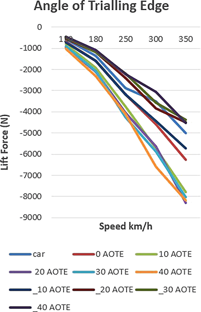 The relationship between speed, angle of trailing edge (AOTE), and the resulting lift force is illustrated in Figure 16 and Table 4. The data points represent measurements taken at specific speeds with corresponding AOTE values, demonstrating how these factors influence the lift force generated. The results highlight the significant impact of AOTE adjustments on vehicle aerodynamics, particularly at higher speeds.
