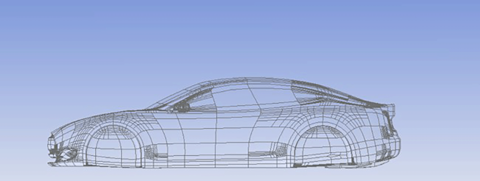 The next step is meshing, where the computational domain is divided into a grid of small elements. Proper meshing is essential for accurate results, as an improperly meshed model can lead to incorrect solutions. Special attention is given to refining the mesh around the car and spoiler, where the interaction between air molecules and the vehicle is most significant. The meshed model is shown in Figure 10.