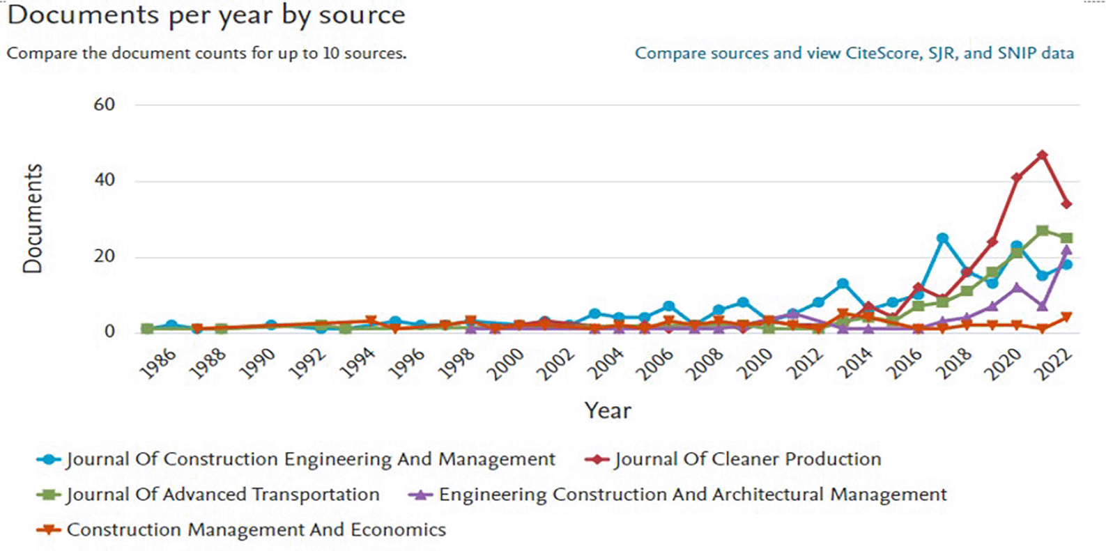 Meanwhile, the graph on the right highlights the sources of publications that focus on the Business, Management and Accounting categories. Journals such as the Journal of Construction Engineering and Management, the Journal of Cleaner Production, and Engineering Construction and Architectural Management are the main sources of publications in this field. The trend of publications in this category has been consistent since 2000 and continues to increase, peaking in recent years. Research in this area has generally focused on project management, sustainability, resource efficiency, and technological innovation in the context of safety.
