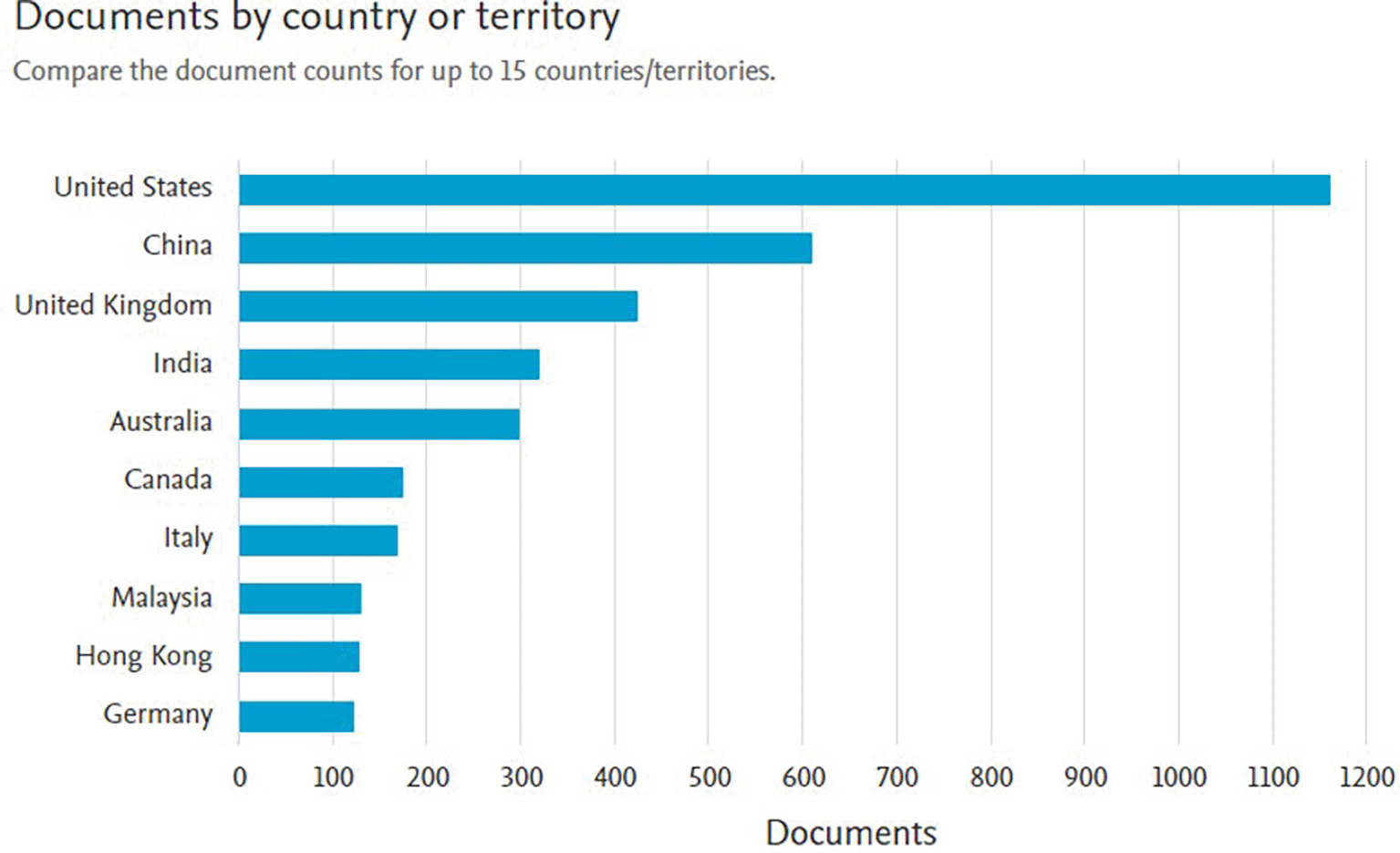 The graph on the right shows the distribution of documents in the Business, Management and Accounting categories. The United States remains in the lead with the highest number of publications (more than 1,000 documents), followed by China, which is close to that number. Countries such as the UK, India, and Australia also make a large contribution, with a smaller but significant number of documents than other countries. Asian countries such as Malaysia and Hong Kong showed a strong presence in this category, reflecting the Asia-Pacific region's focus on safety in the context of business management and sustainability.