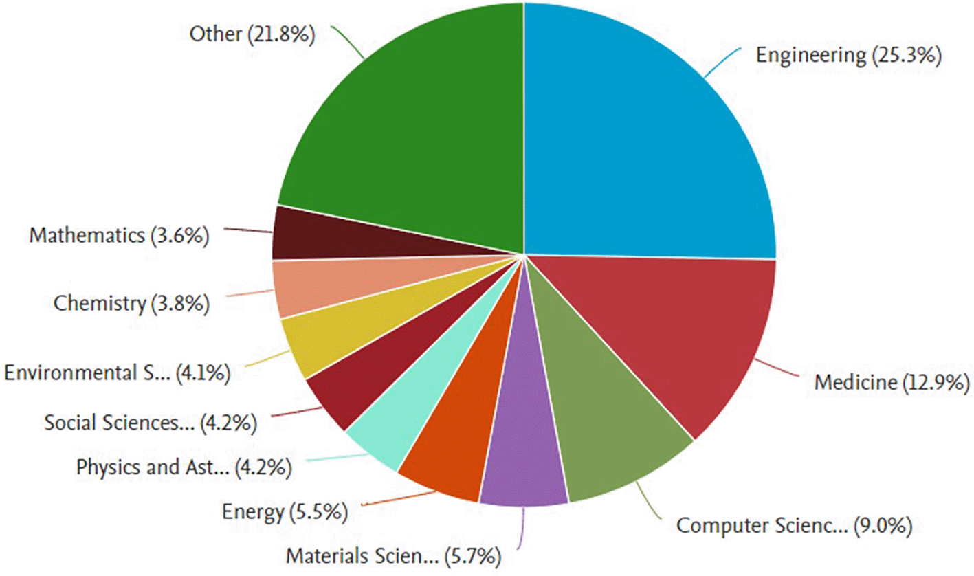 In the graph on the left, which includes all documents related to Safety Performance, the field of engineering dominates, with a contribution of 25.3% of the total documents. Other fields that also made a significant contribution were medicine (15.0%), Computer Science (9.0%), and energy (5.5%). In addition, fields such as Social Sciences (4.9%) and environmental sciences (4.2%) also played an important role in this research. The dominance of the engineering field indicates that safety issues are generally rooted in technology and technical implementation in various industrial sectors.
