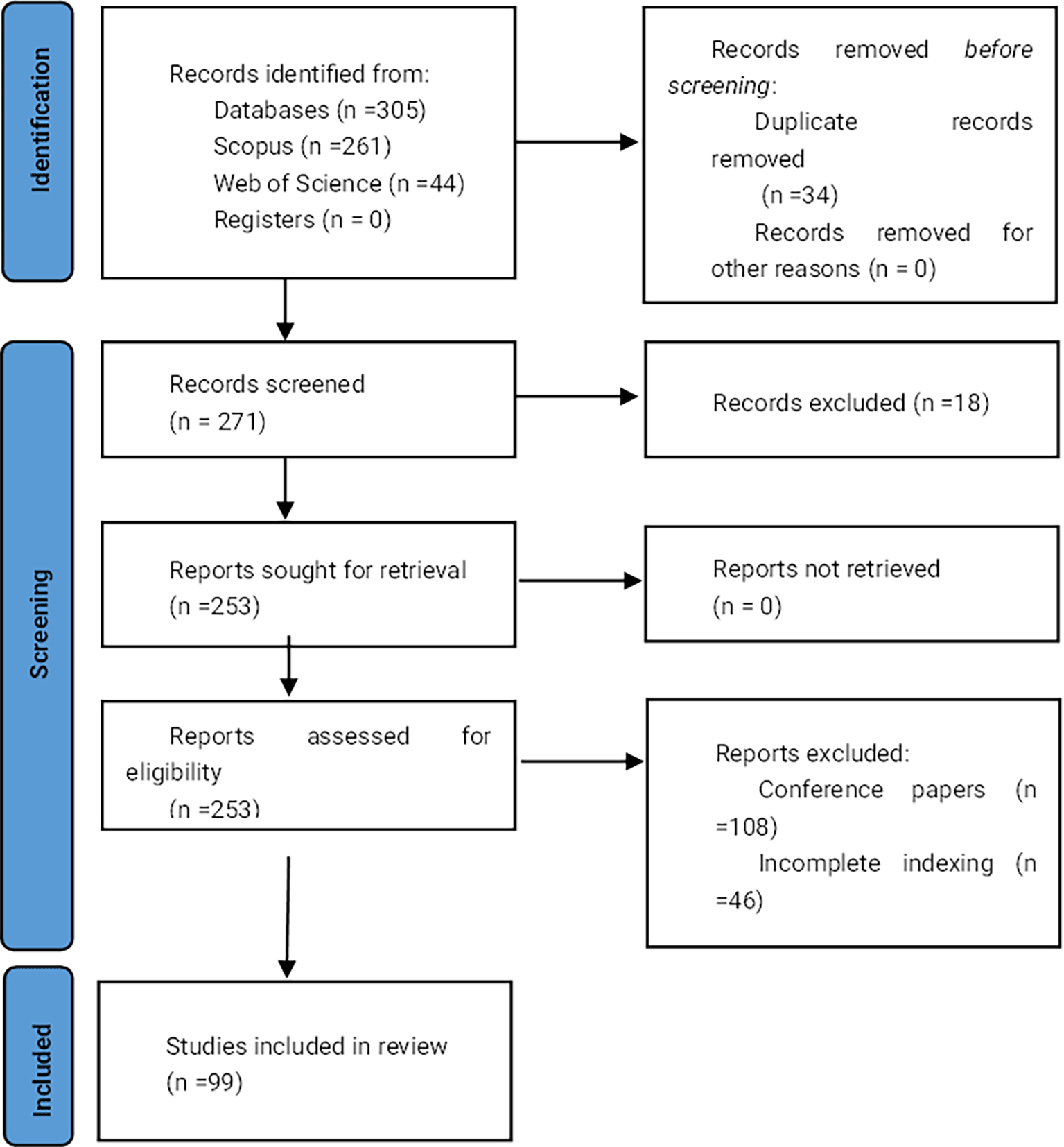 Once the search equations were applied in the databases, 261 records were obtained from Scopus and 44 from Web of Science, totaling 305 records. Subsequently, duplicates were removed, resulting in 271 documents that were then subjected to inclusion and exclusion criteria. After applying these eligibility criteria, 99 documents were selected for analysis. Figure 1 displays the flowchart of the document selection process.