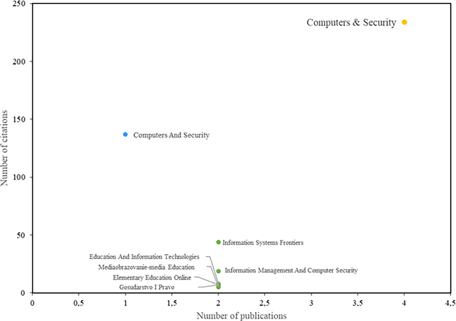 Figure 4 shows the journals with the greatest impact on the field of study. Among them, the journal Computers & Security stands out, having both the highest number of publications and the highest number of citations. Notably, the study by Safa et al. (Safa et al., 2015) has 226 citations and is recognized as one of the most relevant publications in this field. Additionally, the study by Rezgui and Marks (Rezgui & Marks, 2008) also warrants special attention, as it aligns with the trends identified in this research and has 138 citations.