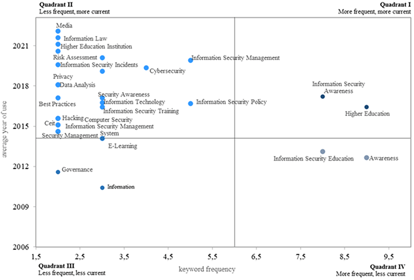 The second quadrant highlights topics that, while less recurrent in the literature, are considered relevant, especially in recent years. Key aspects include information laws, higher education institutions (HEIs), risk assessment, cybersecurity, information security incidents, data analysis, security awareness, best practices, information technologies, information security policy, information security training, hacking, computer security, information security management, and security management. These keywords also hold significant potential for future research.