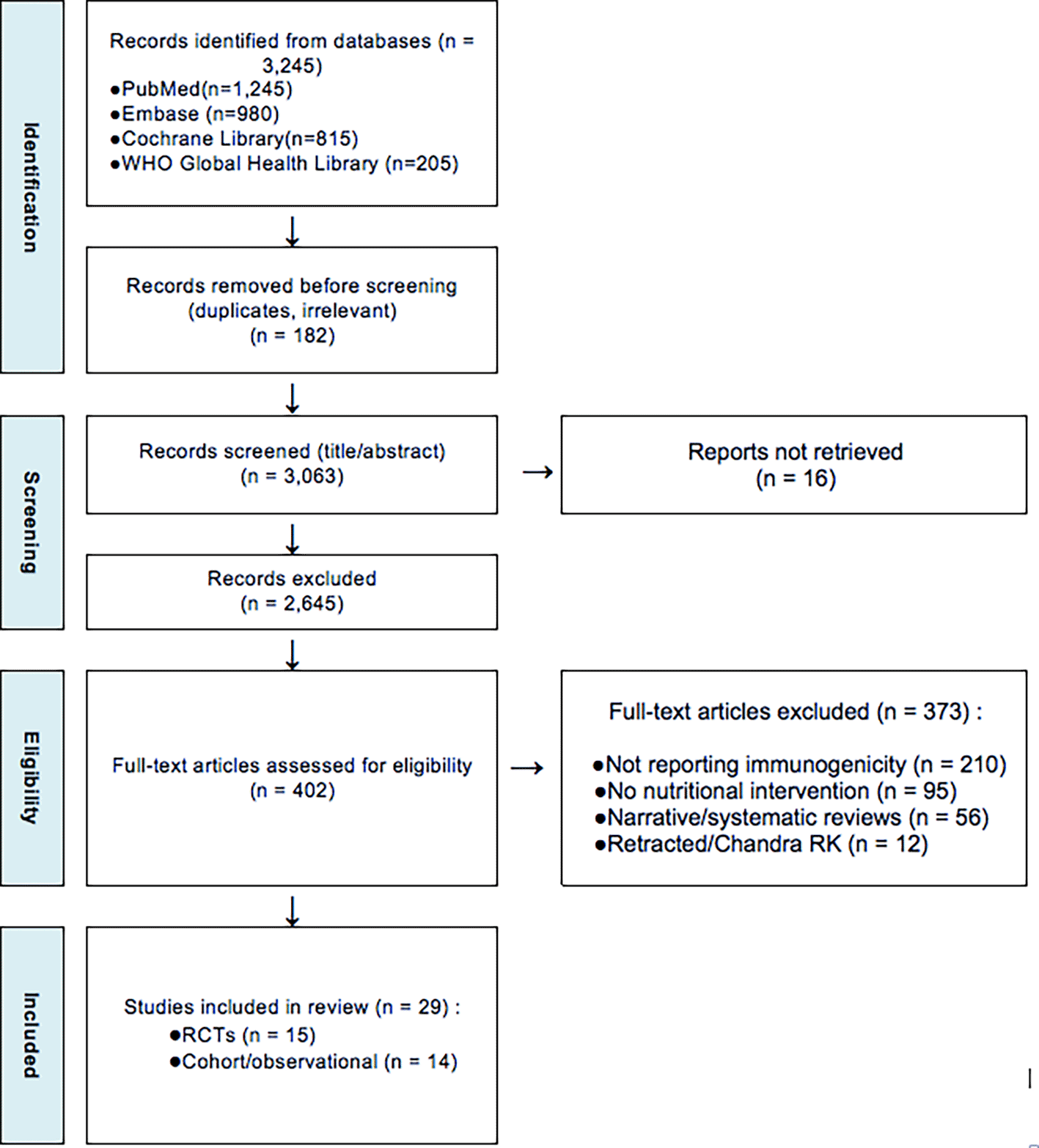 This flowchart illustrates the systematic selection of studies for inclusion in the review. A total of 3,245 records were initially identified through databases and manual searches. After removing 182 records (due to duplication and irrelevance), 3,063 abstracts were screened. Of these, 2,645 were excluded for not meeting inclusion criteria (e.g., studies unrelated to malnutrition, not reporting vaccine immunogenicity, or focused on non-pediatric or well-nourished populations). Subsequently, 402 full-text articles were assessed in detail. An additional 360 articles were excluded for reasons such as lack of immunogenicity outcomes, absence of nutritional interventions, or being non-original studies (e.g., editorials, opinion pieces). Ultimately, 29 studies met all eligibility criteria and were included in the final systematic review. Full study characteristics are provided in Supplementary Table S1, hosted on Zenodo (see Data Availability section).