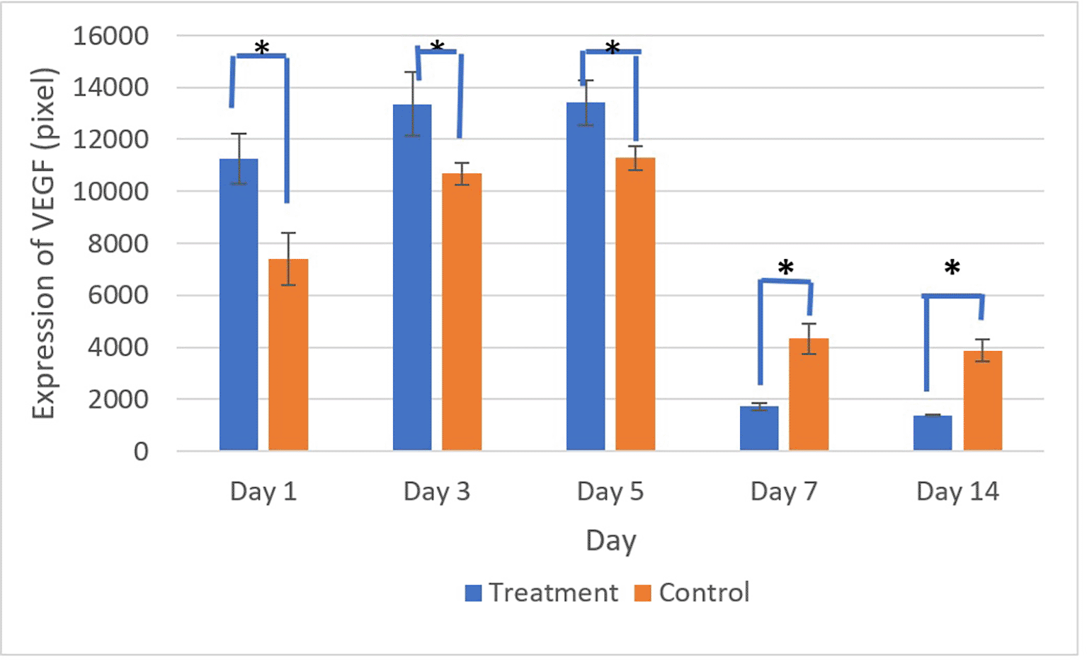 There was a significant difference in VEGF expression between the control and treatment groups on all days (*) (p<0.05).