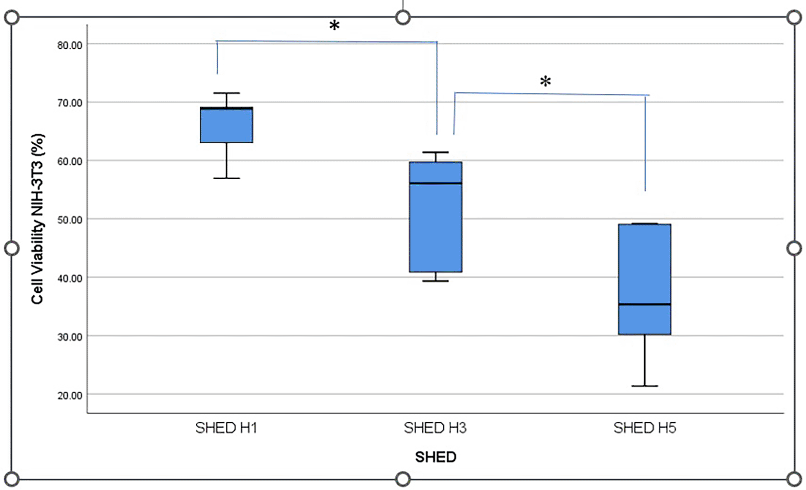 Cell viability was indicated by black living cells and fuzzy crystals at the bottom of the well after MTT application. The highest viability of NIH-3T3 fibroblast cells was shown after applying SHED-SM H1.