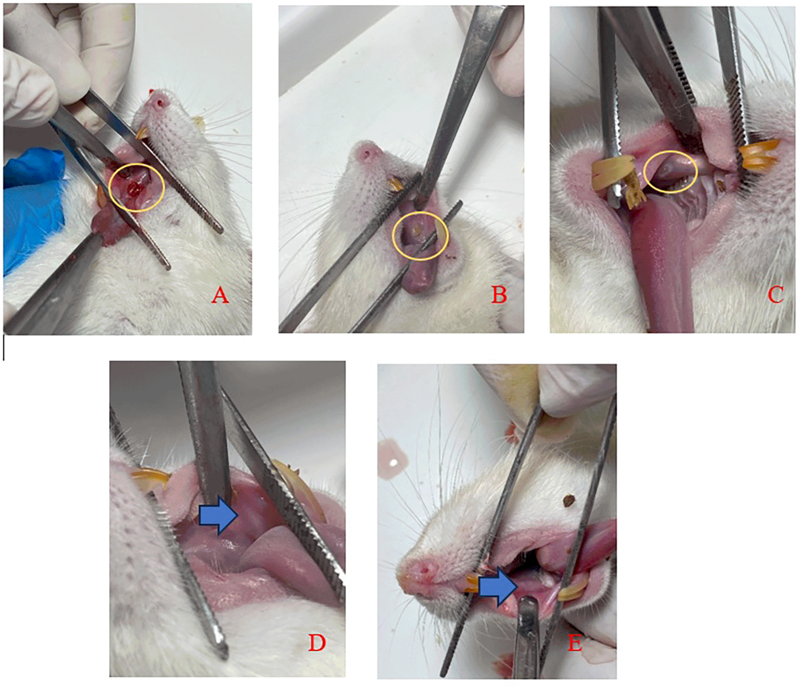 In the experimental animal treatment, clinical observations indicated that traumatic ulcers healed following both treatment and control applications. By the 5th day, the ulcers were observed to have closed, and by the 7th day, no ulcers were visible ( Figure 3). Histological observations using Hematoxylin Eosin staining corroborated these findings. In the treatment group, the epithelium appeared closed by the 5th day, whereas in the control group, it remained open ( Figure 4).