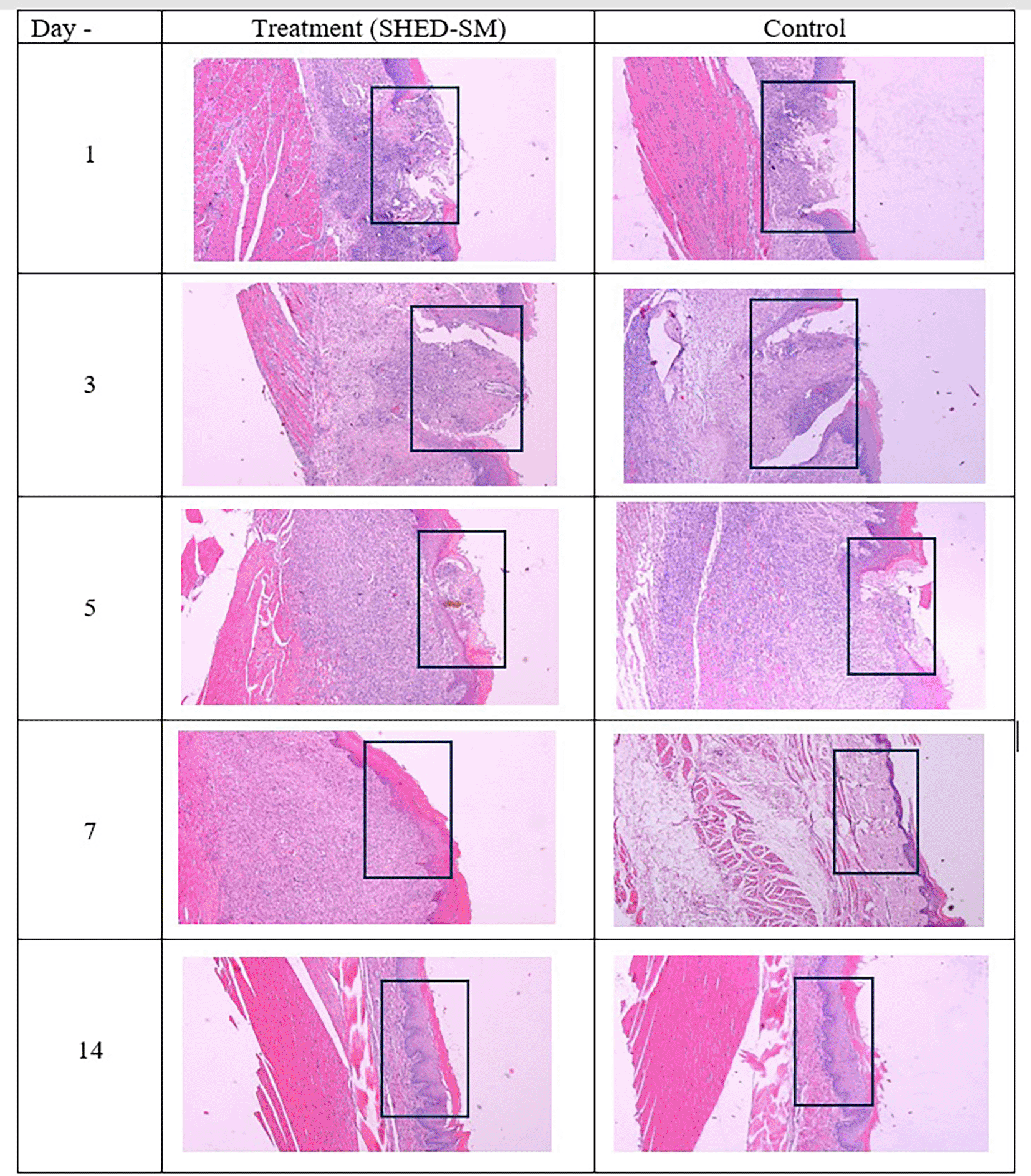 Figure 4 illustrates the ulcer healing process after applying treatment with SHED Spent Medium (SHED-SM) nanoemulgel compared to the control group treated with Aloclair Plus gel. On the 1st day, inflammatory cell infiltration was seen until 3rd day. On the 5th day after treatment, epithelial closure was evident in the treatment group, while the control group demonstrated incomplete epithelial closure. On the 7th and 14th days, the ulcers were fully closed in both groups. On the 7th day, the treatment group displayed thicker epithelial layers compared to the thinner epithelium in the control group.26