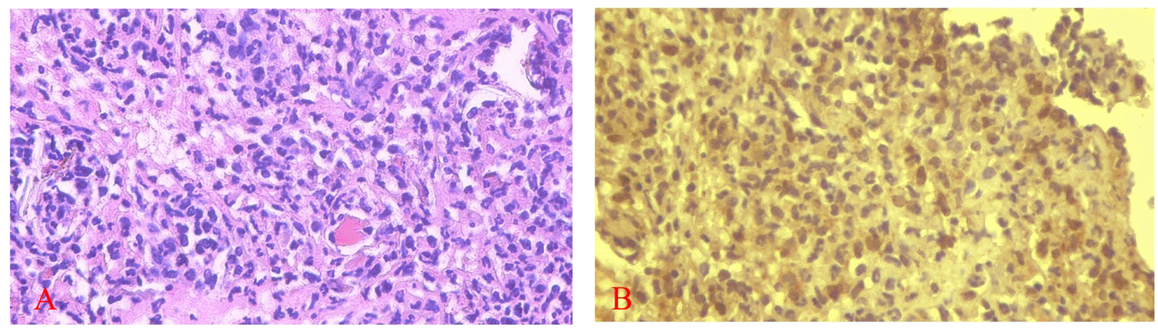 COX-2 expression was seen in the cytoplasm of cells. HE staining (A) and immunohistochemistry (B) at 400x magnification.